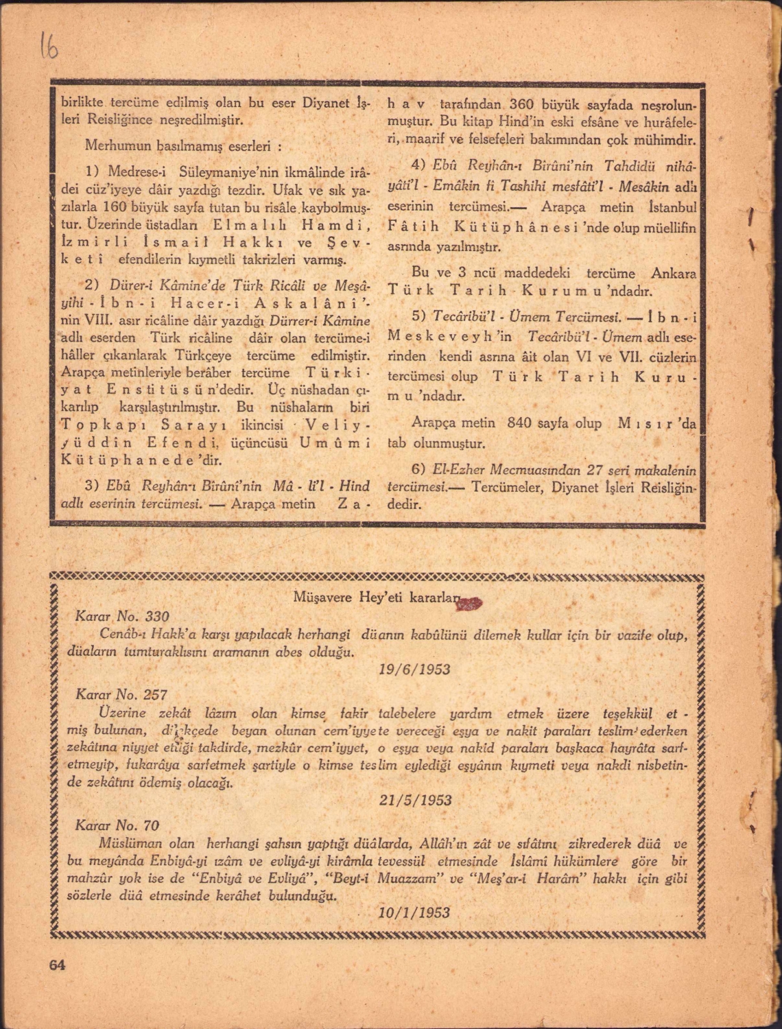 Diyanet İşleri Reisliği Mecmuası - Ramazan nüshası), 1. Sayı, Ankara, 1956, sırtı haliyle, 62 sayfa, 20x26 cm