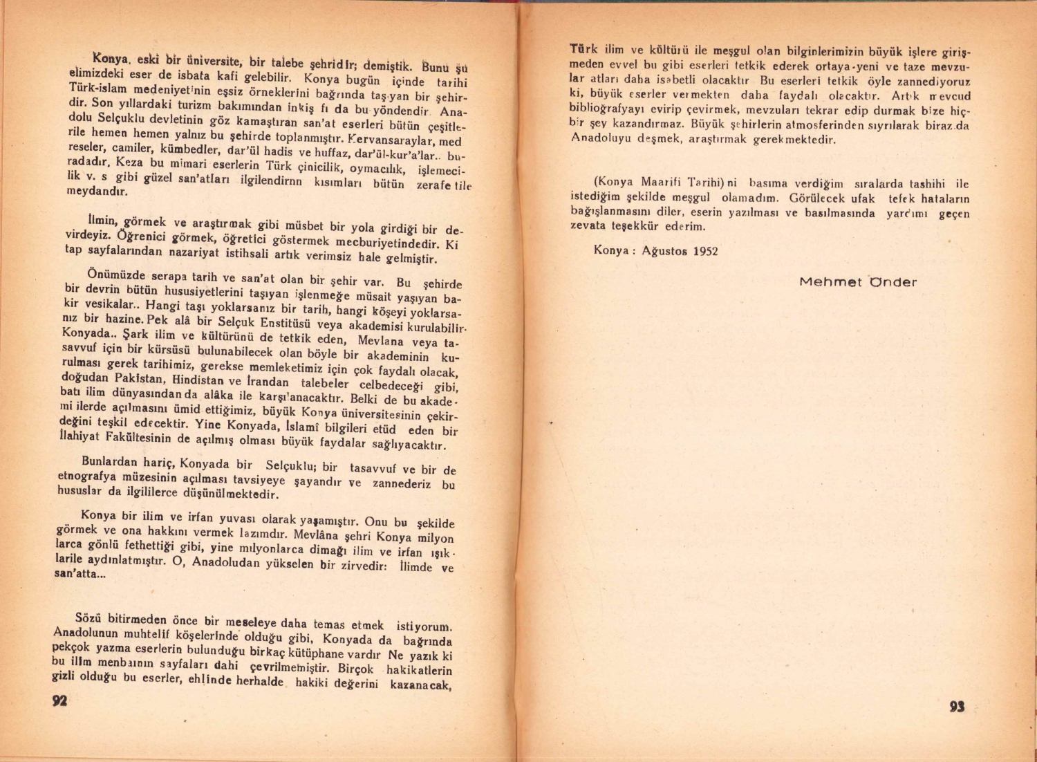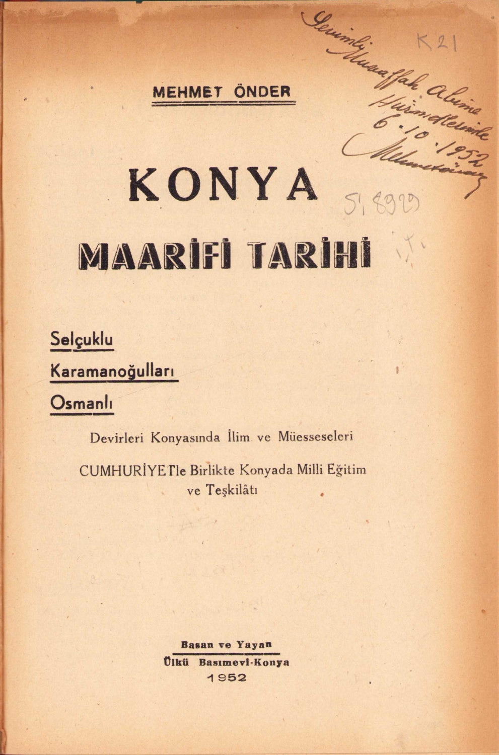 Konya Maarifi Tarihi, Mehmet Önder, kONYA, 1952, yazarından ithaflı ve imzalı, 93 sayfa, 16x24 cm
