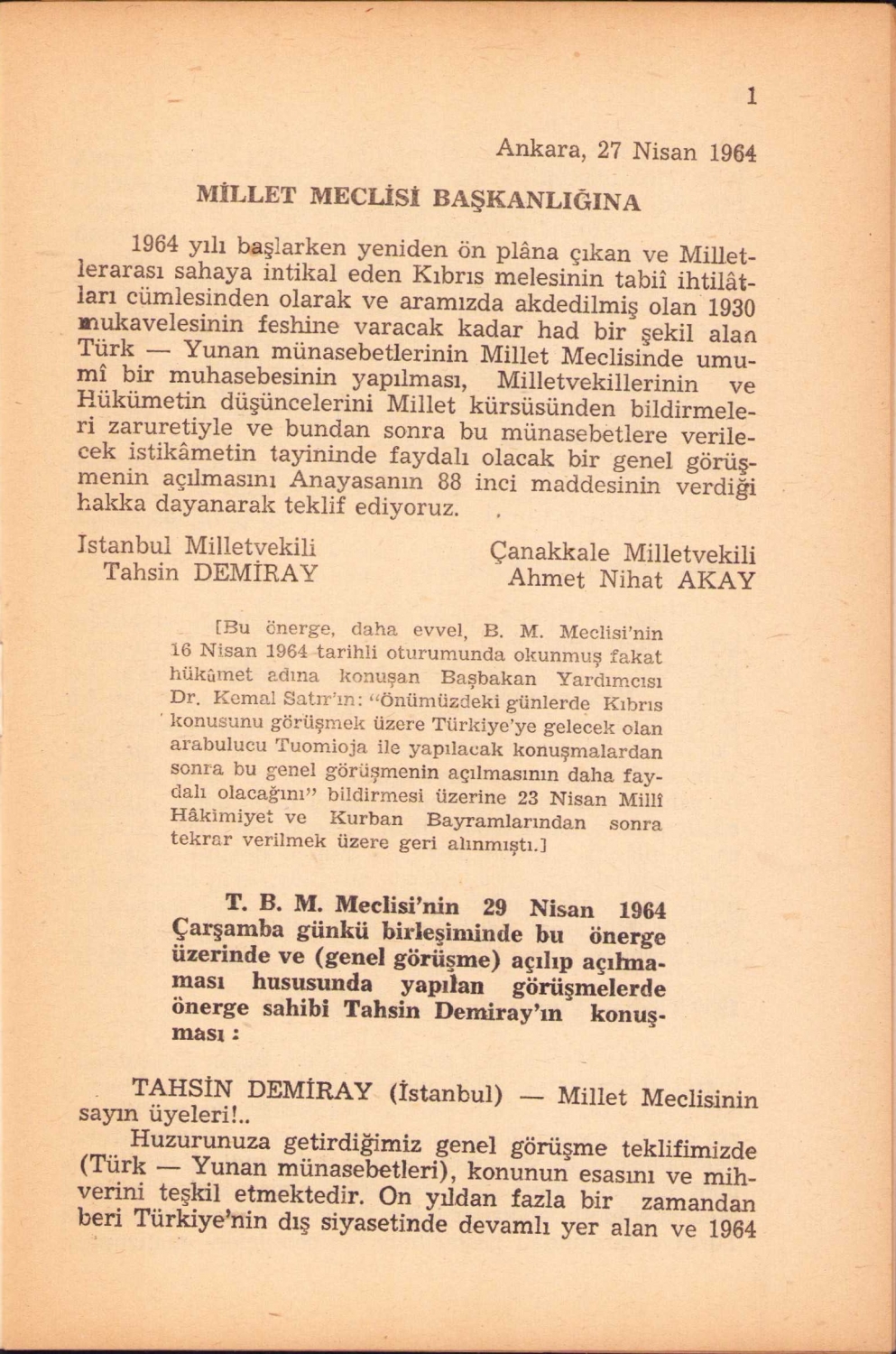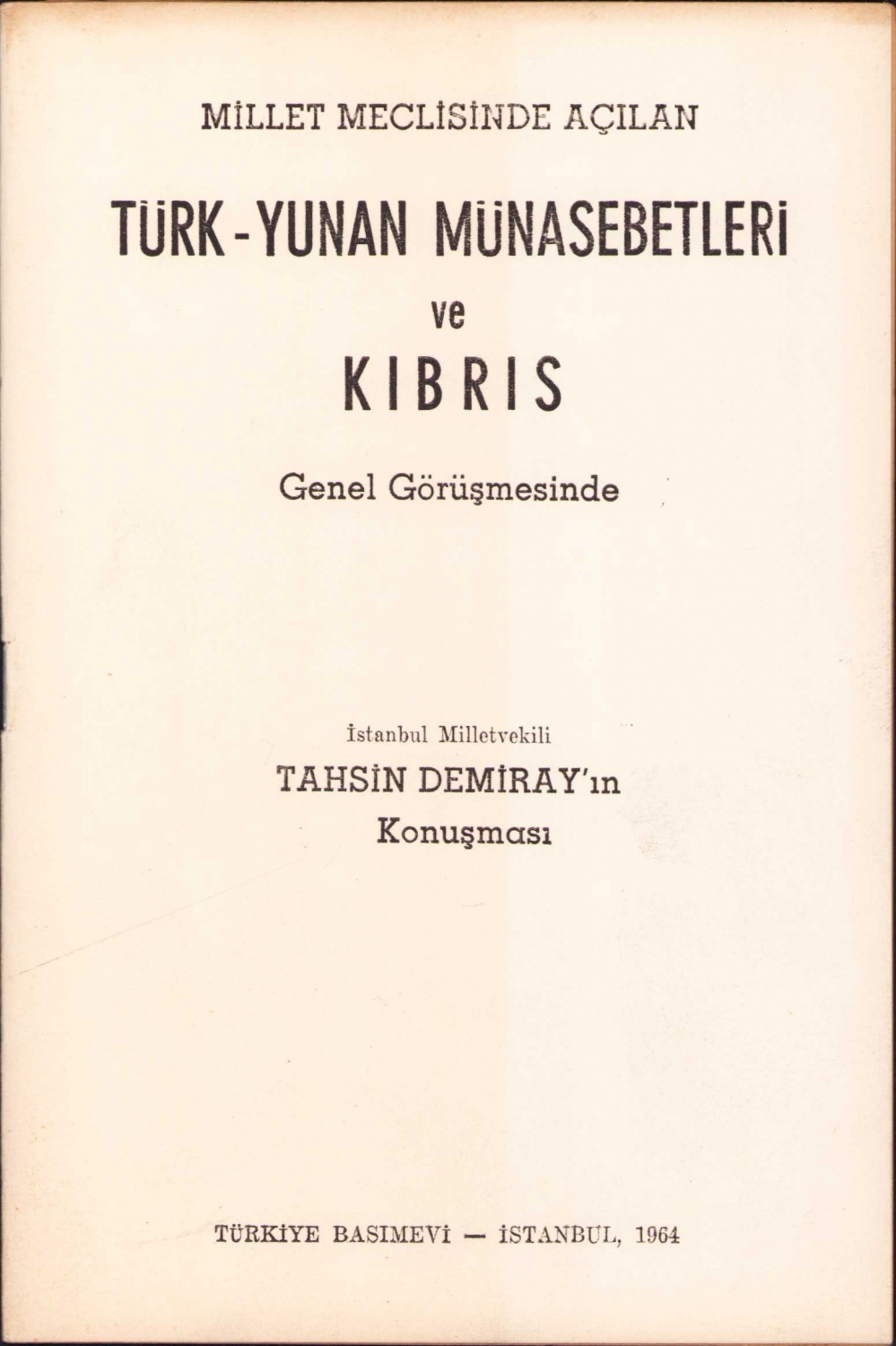 Millet Meclisinde Açılan Türk - Yunan Münasebetleri ve Kıbrıs Genel Görüşmesinde, Tahsin Demiray'ın konuşması, İstanbul, 1964, 32 sayfa, 14x20 cm