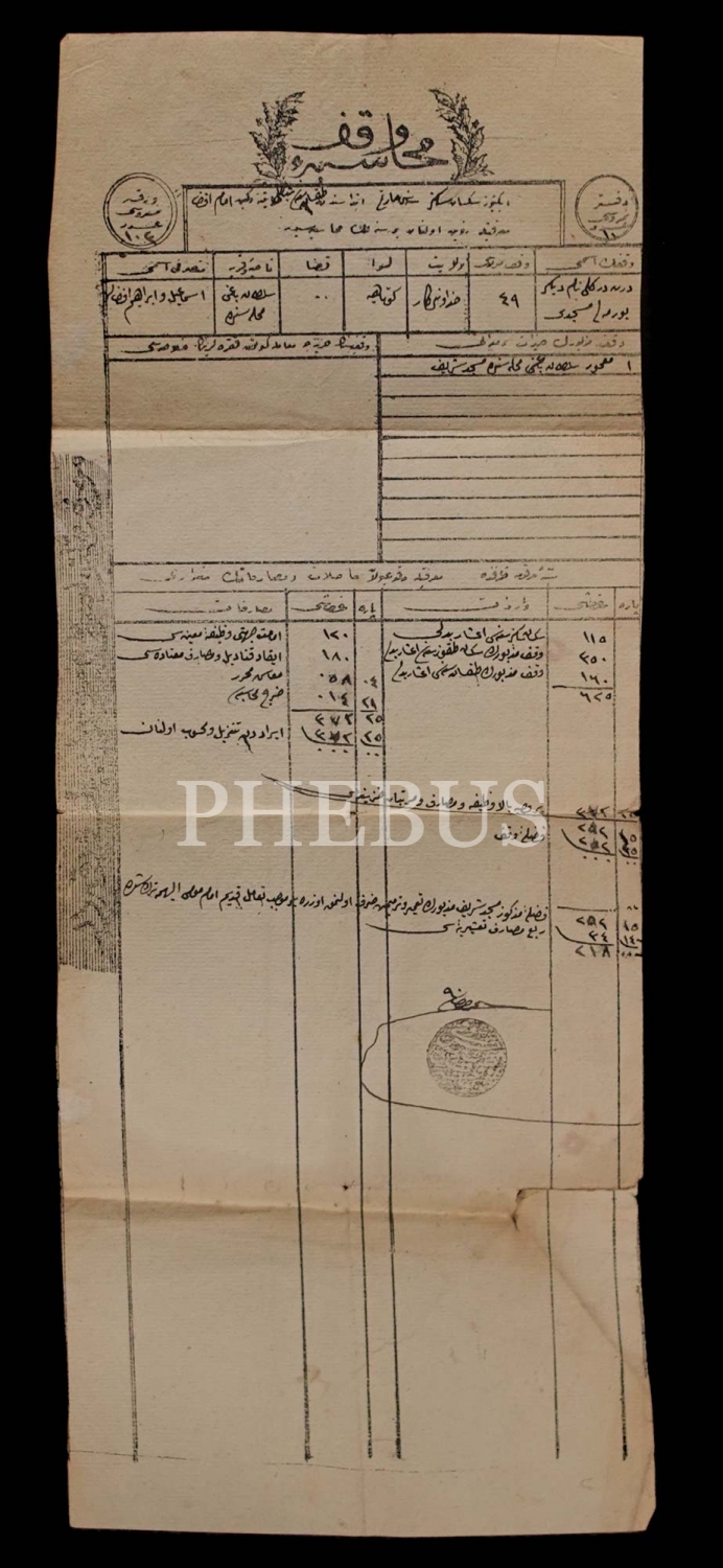 Kütahya´da bulunan Dört Direkli Cami (Burmalı Mescid) ´nin vakfının 1288 senesi muhasebe evrakı, 44x17 cm...