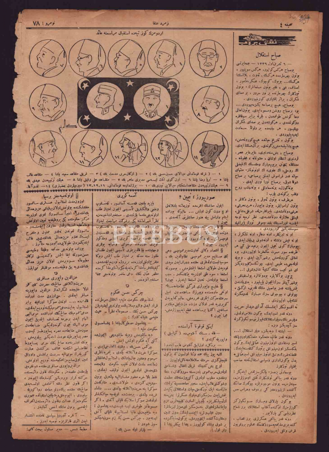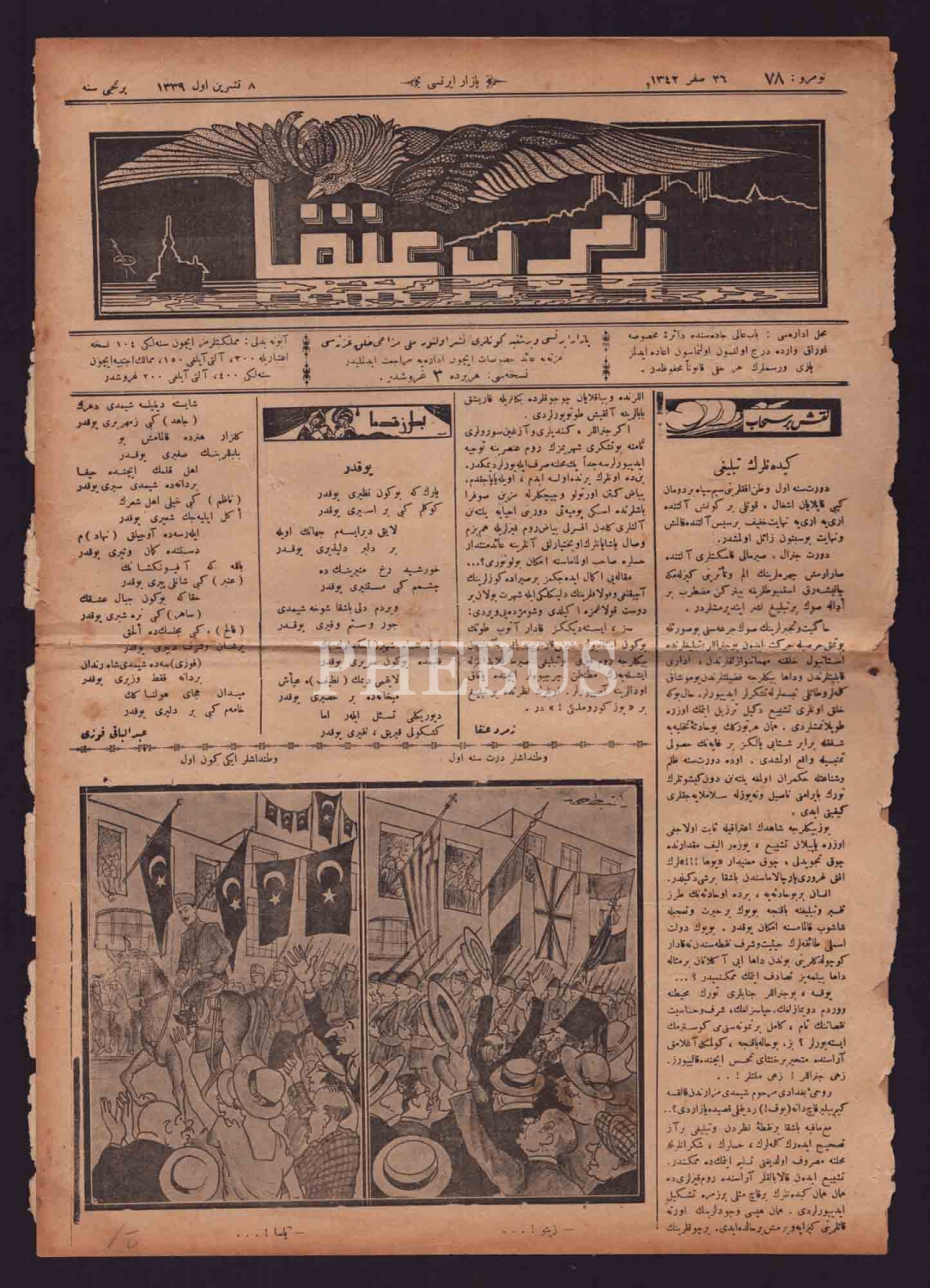 ZÜMRÜD-Ü ANKA gazetesinin İstanbul´un düşman işgalinden kurtuluşu konulu 26 Safer 1342 tarihli nüshası, 28x38 cm...