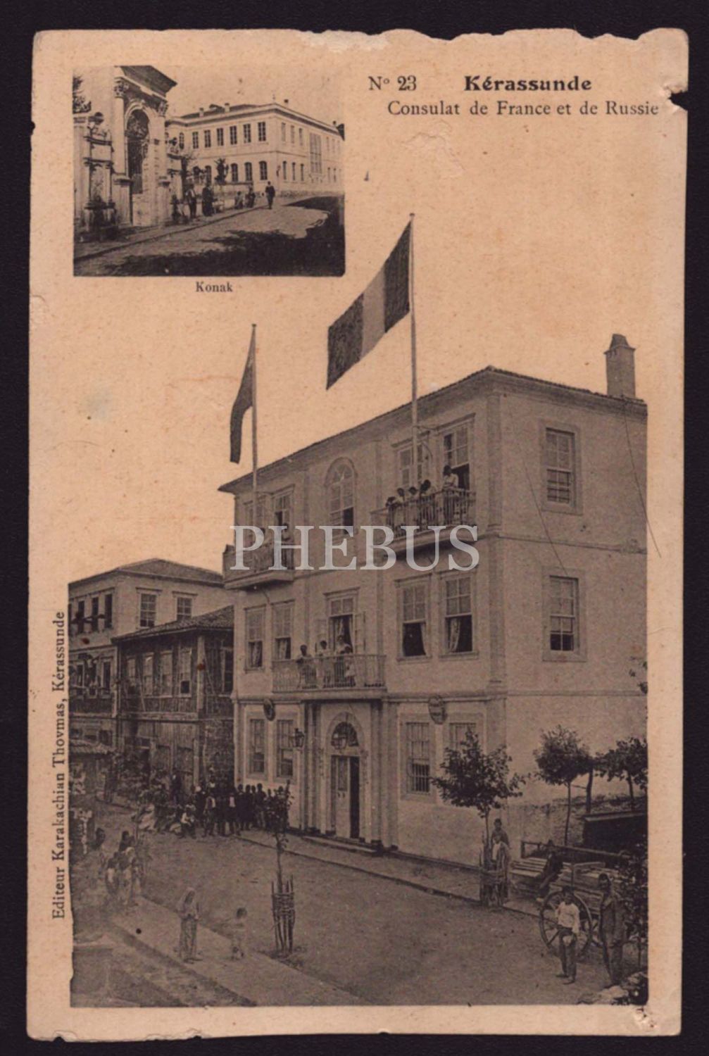 Giresun'daki Rusya ve Fransız Konsolosluk binalarının görüldüğü parçalı kartpostal, "Kerassunde (Giresun) - Consulat de France et de Russie", ed. Karakachian Thovmas, Kerassunde, 14x9 cm...