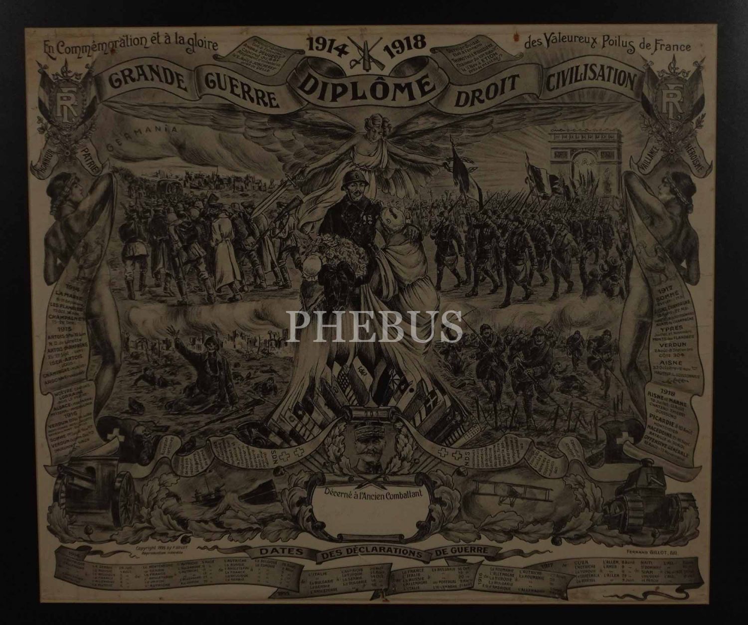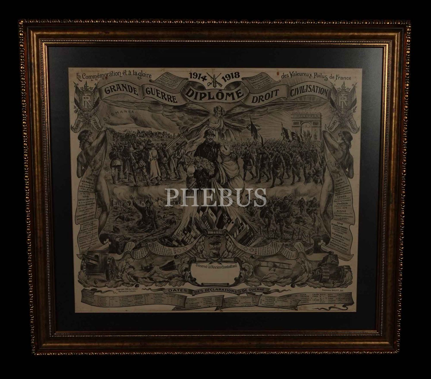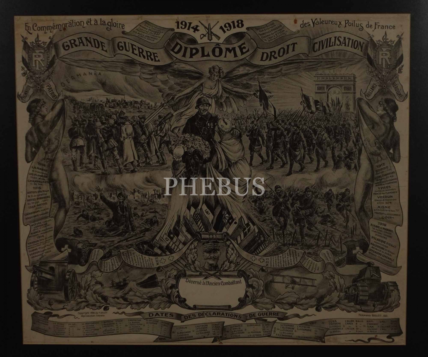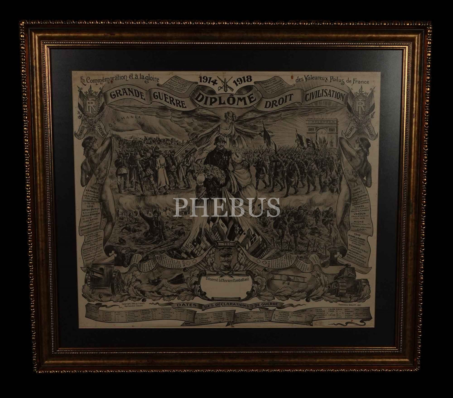 Birinci Dünya Savaşı'na katılan Fransız askerlerine verilen hatıra diploması, "Grande Guerre Diplome Droit Civilisation", çerçevesiyle birlikte 66x59 cm...
