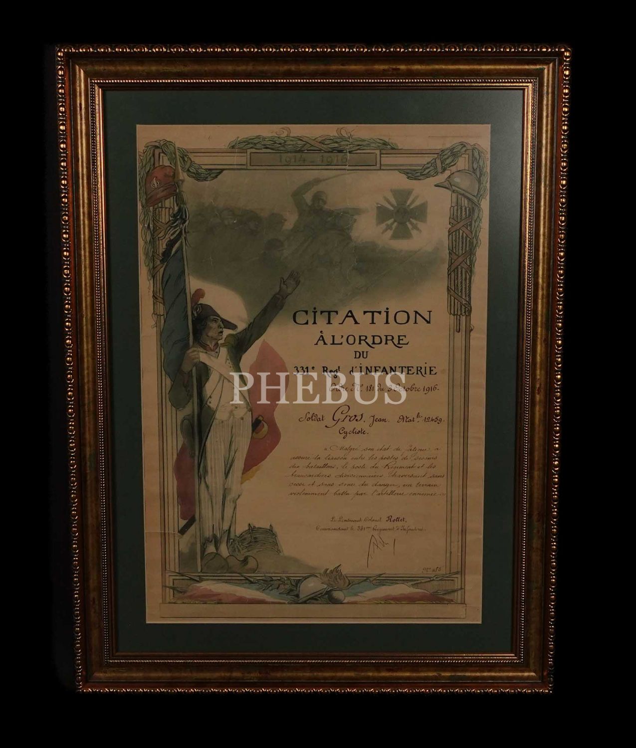 Birinci Dünya Savaşı´nda gösterdiği kahramanlıktan dolayı Jean Cycliste´ye verilen takdirname, çerçevesiyle birlikte 52x69 cm...