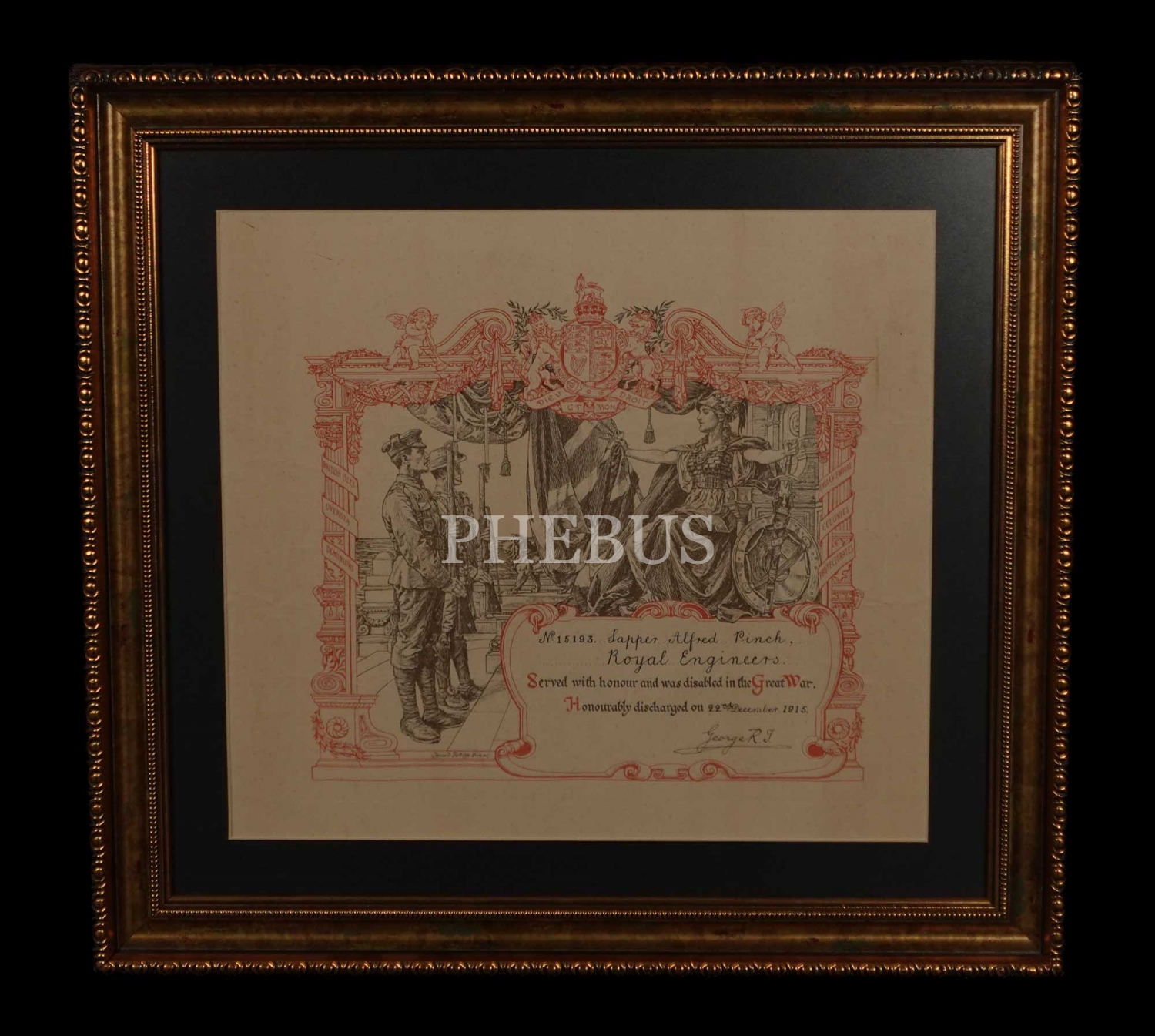 Birinci Dünya Savaşı´nda yaralanan Alfred Pinch´e İngiltere Kraliyeti tarafından verilen takdirname, çerçevesiyle birlikte 56x52 cm...