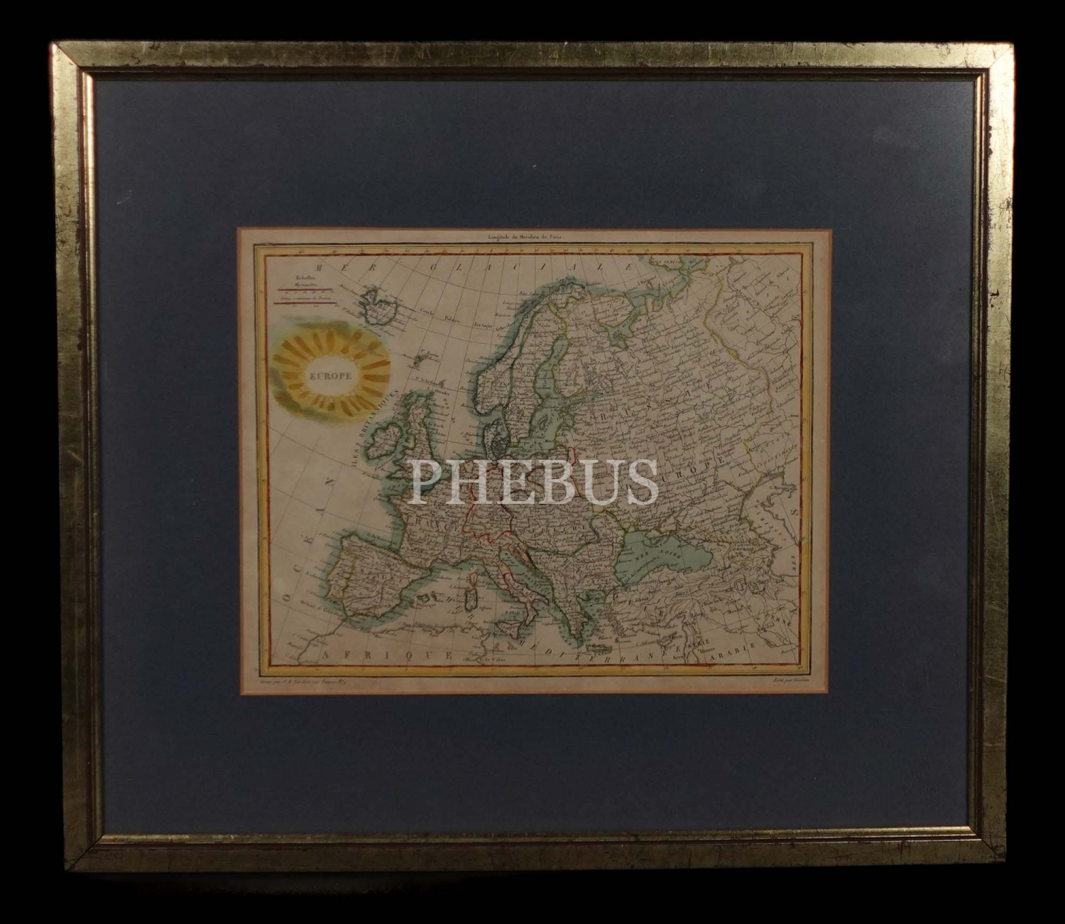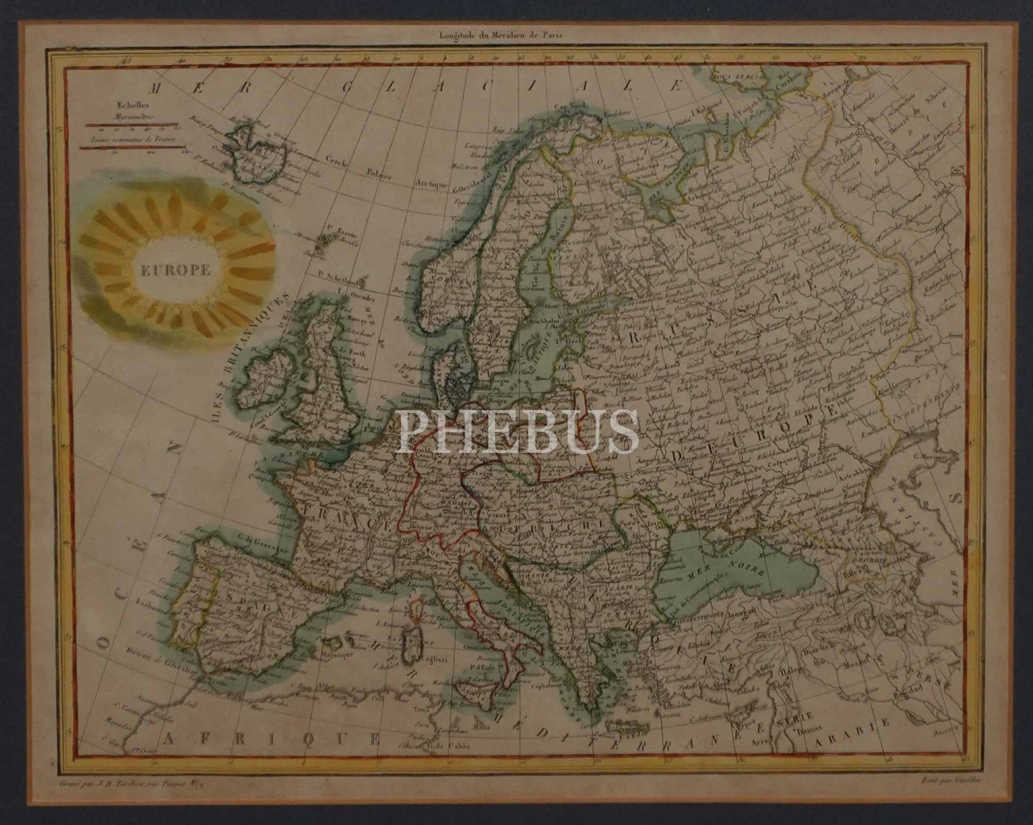 Paris meridyen yayı kıyas alınarak J. B. Turdieu tarafından çizilen Avrupa haritası, çerçevesiyle birlikte 48x42 cm...