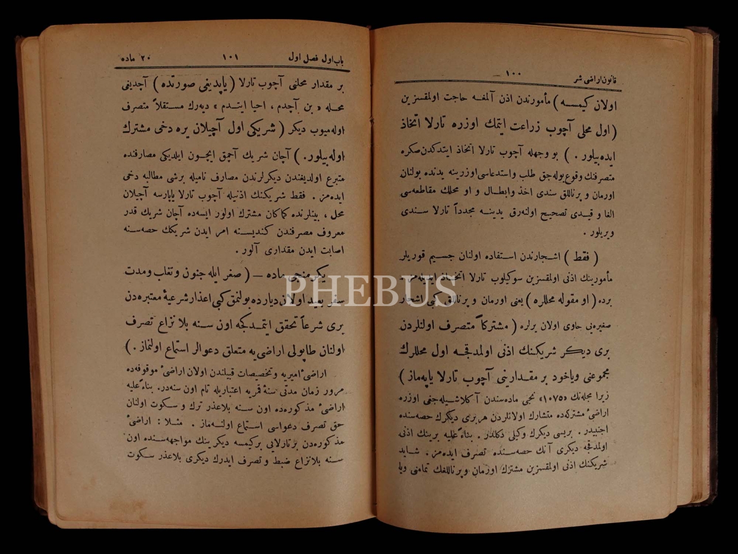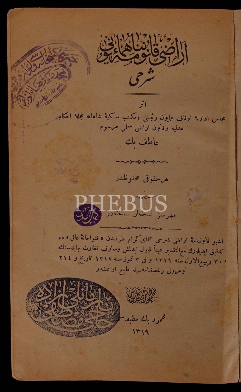ARAZİ KANUNNAME-İ HÜMAYUNU ŞERHİ, Atıf, 1319, Mahmud Bey Matbaası, 432 sayfa, 14x20 cm...