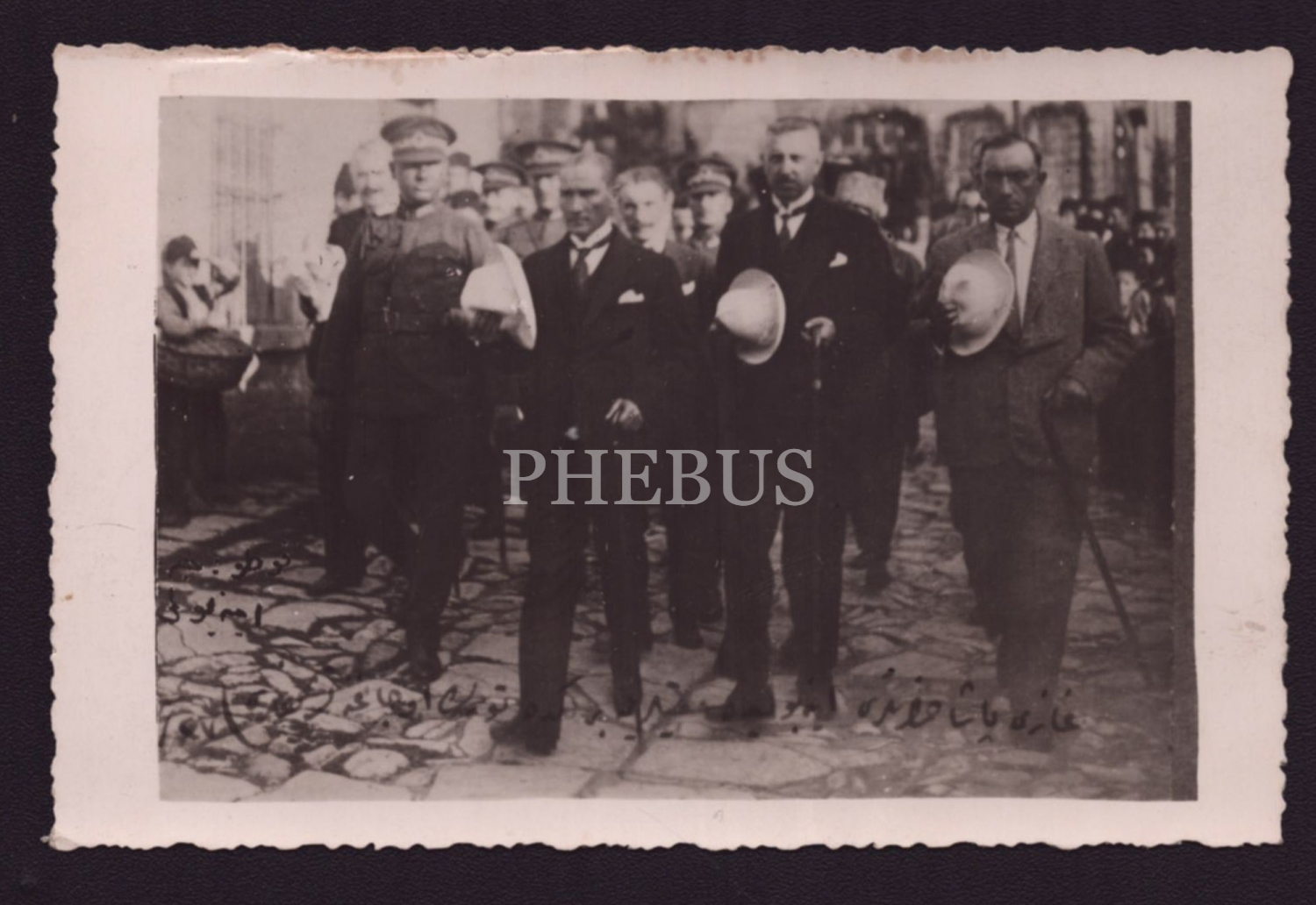Mustafa Kemal Atatürk´ün Kastamonu´da halk önünde ilk defa şapka giydiği ve Şapka Devrimi´nin hemen öncesinde meşhur Şapka Nutkunu gerçekleştirdiği İnebolu Türk Ocakları ziyaretinden bir enstantane, 13x8 cm...