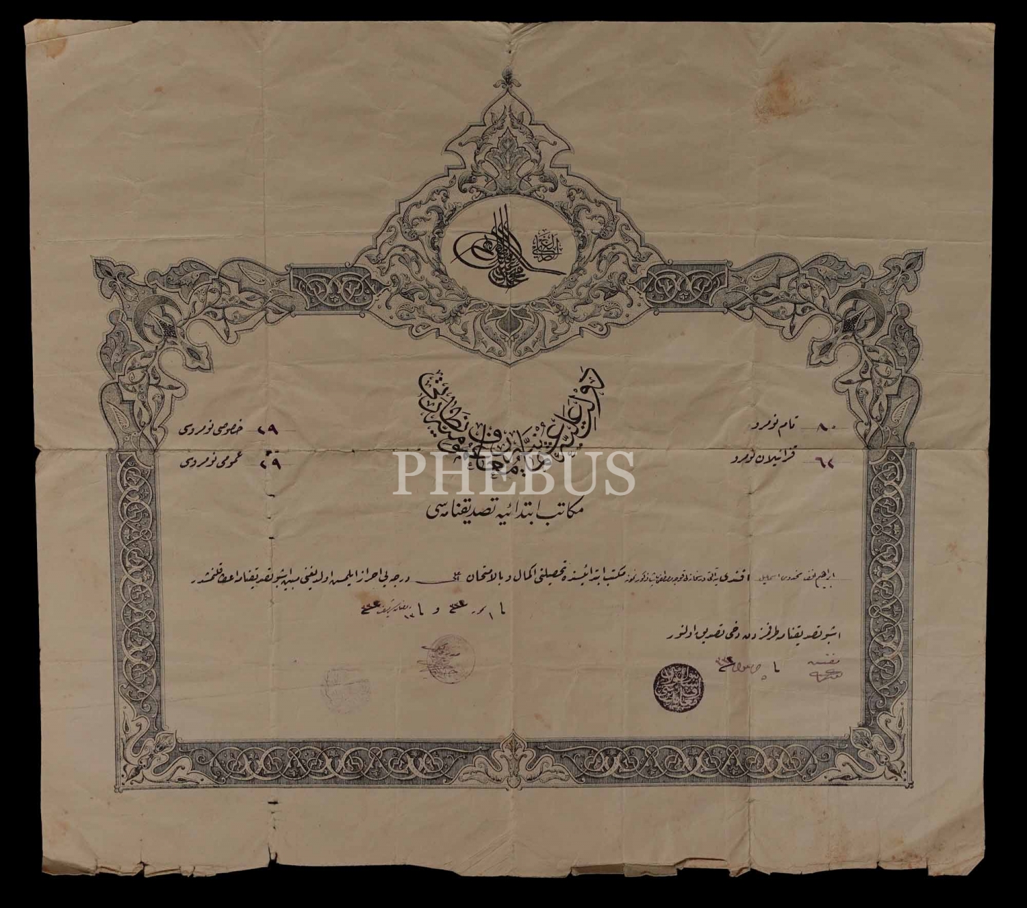 Koca Mustafa Paşa Numune Mektebi tarafından İbrahim Efendi mahdumu İsmail Efendi´ye verilen Sultan II. Abdülhamid tuğralı ilkokul diploması, 43x38cm...