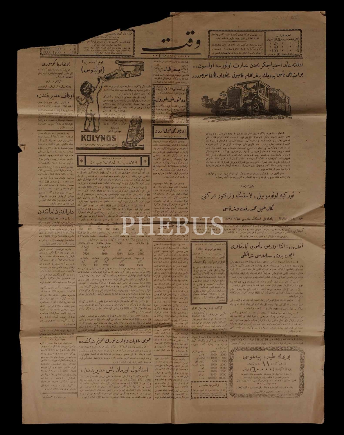 Atatürk´ün İstanbul´a gelişini manşetine taşıyan VAKİT gazetesinin 5 Haziran 1928 tarihli nüshası, 46x62 cm...