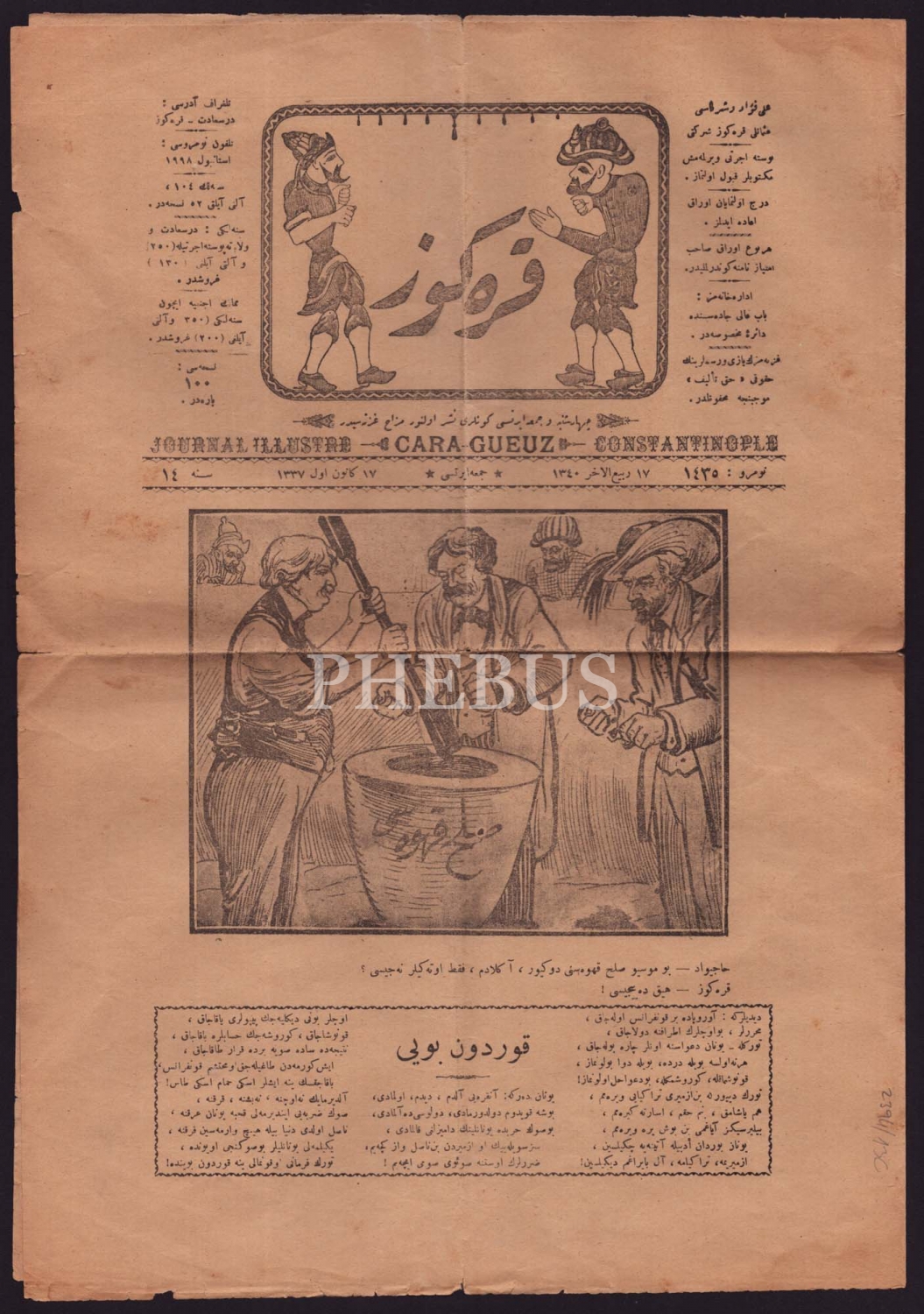 KARAGÖZ gazetesinin 17 Rabiulahir 1340 tarihli, "Sulh Kahvesi" konulu 1435. sayısı, 28x40 cm...