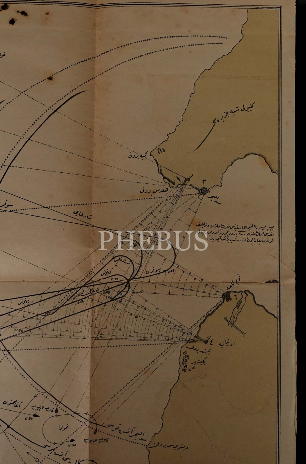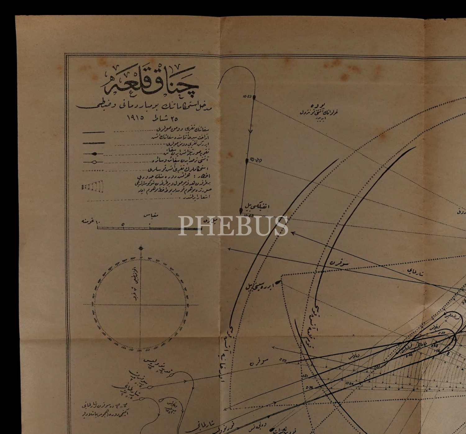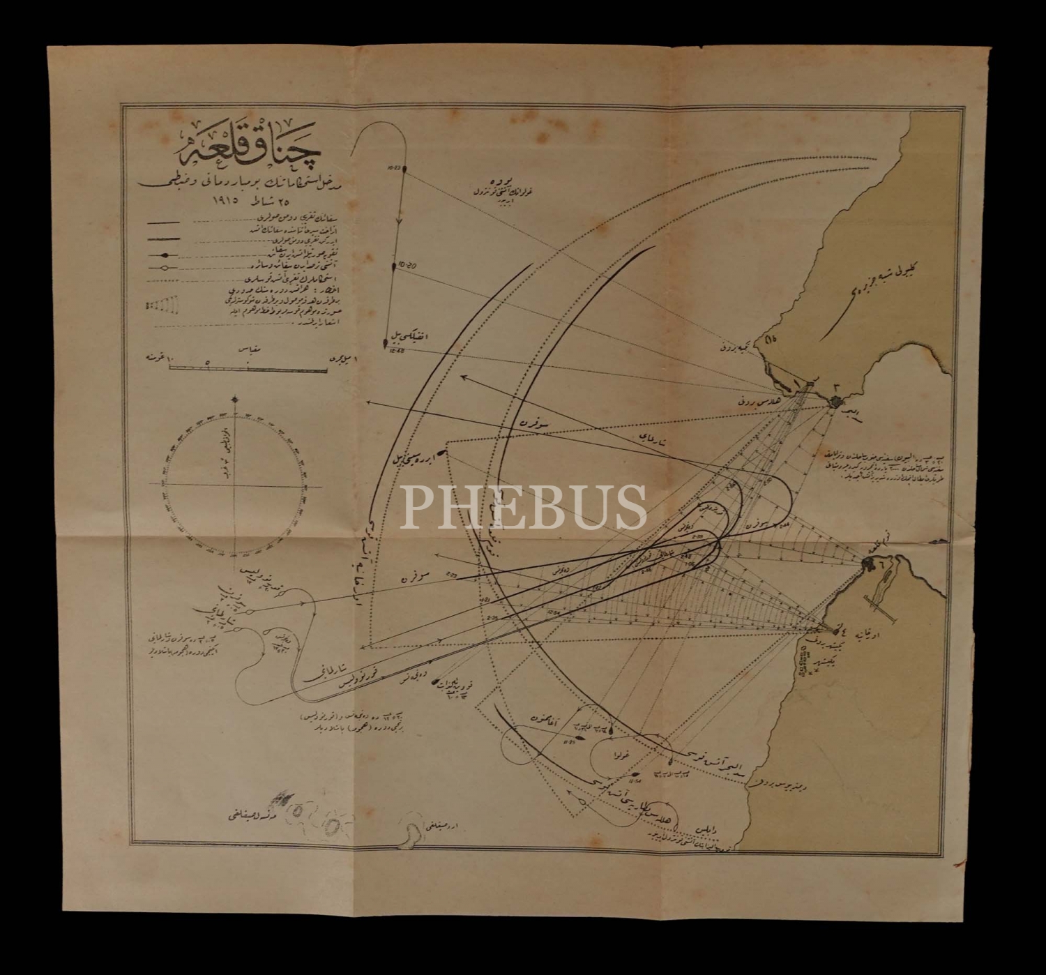 Çanakkale Boğazı´ndan açık denize doğru bombardımanı gösteren 25 Şubat 1915 tarihli ve "Müdhil istihkamatının bombardımanı ve zaptı..." yazılı Osmanlıca Çanakkale haritası, 37x39 cm...