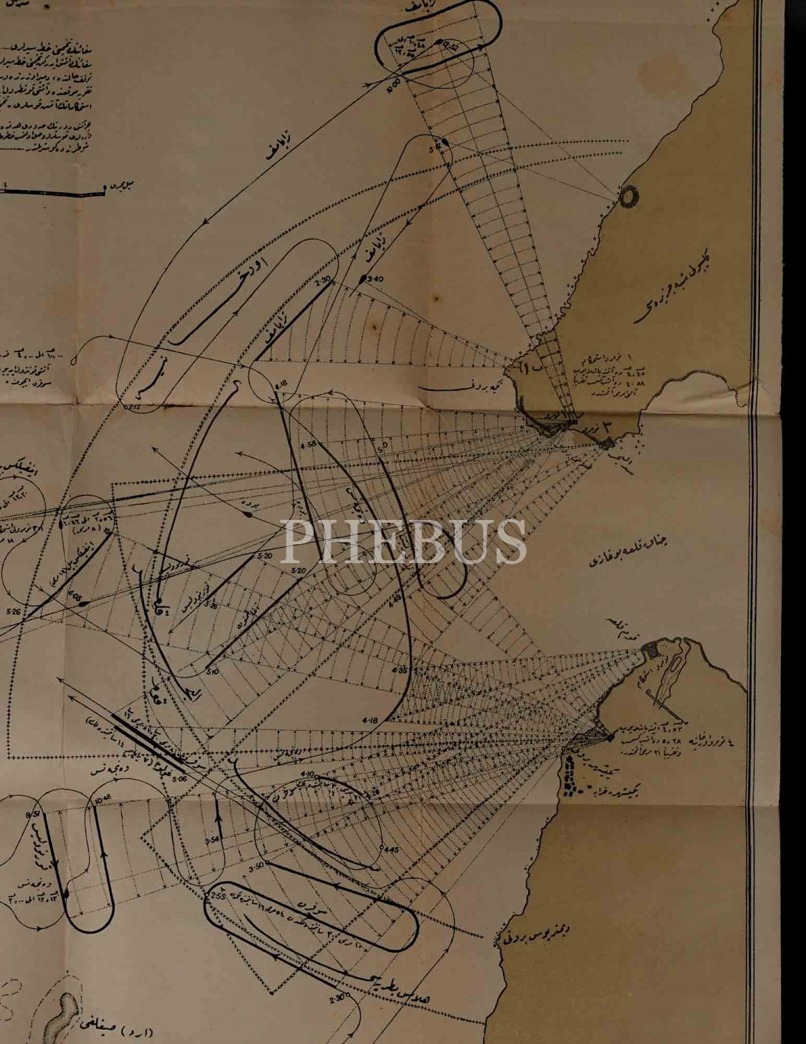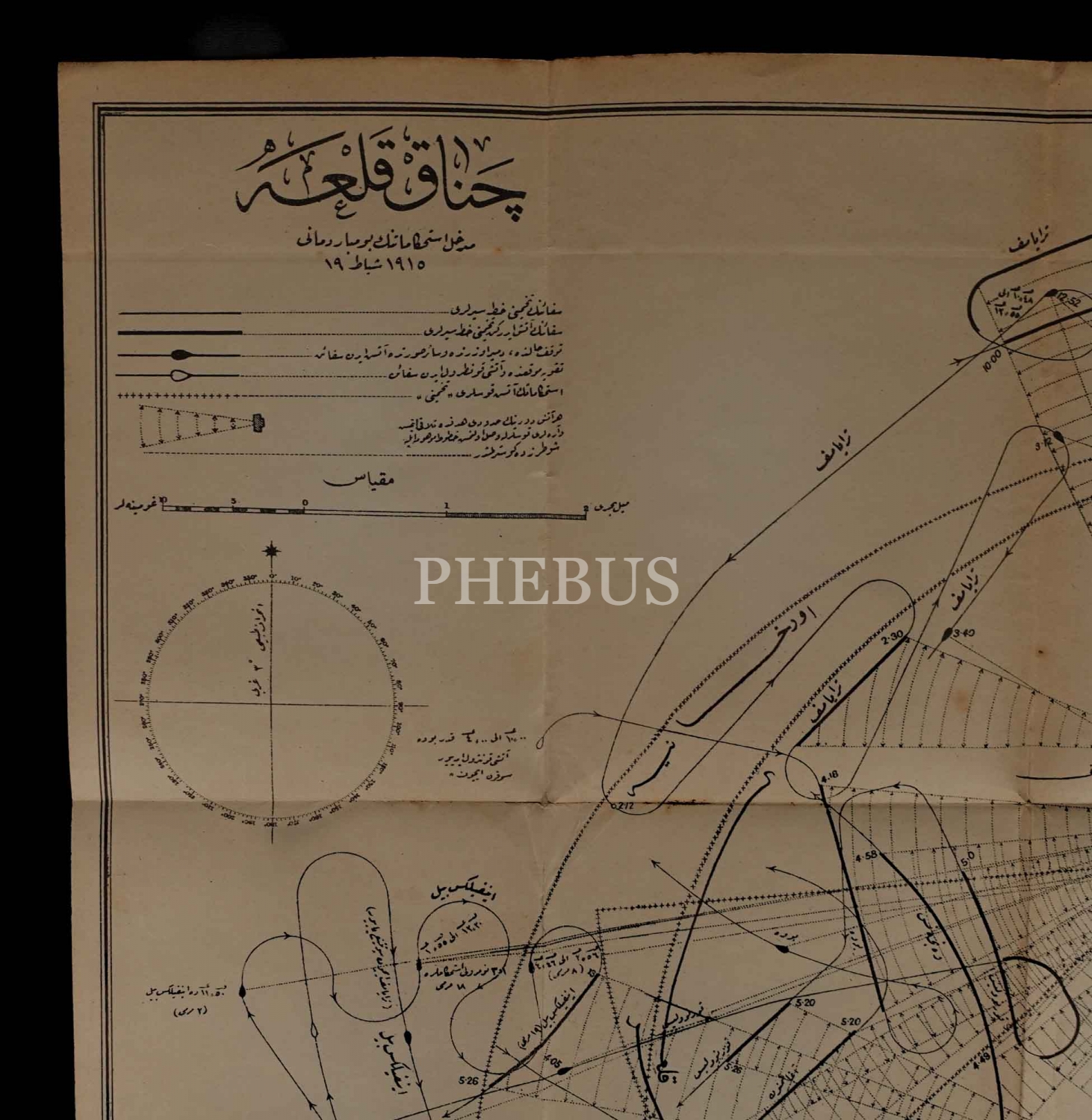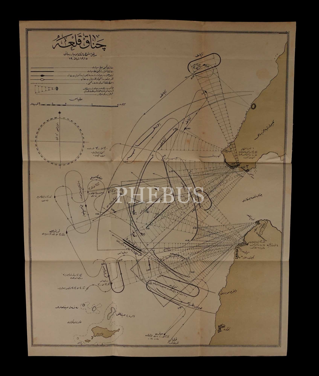 Çanakkale Boğazı´ndan açık denize doğru bombardımanı gösteren 19 Şubat 1915 tarihli ve "Müdhil istihkamatının bombardımanı ve zaptı..." yazılı Osmanlıca Çanakkale haritası, 40x50 cm...