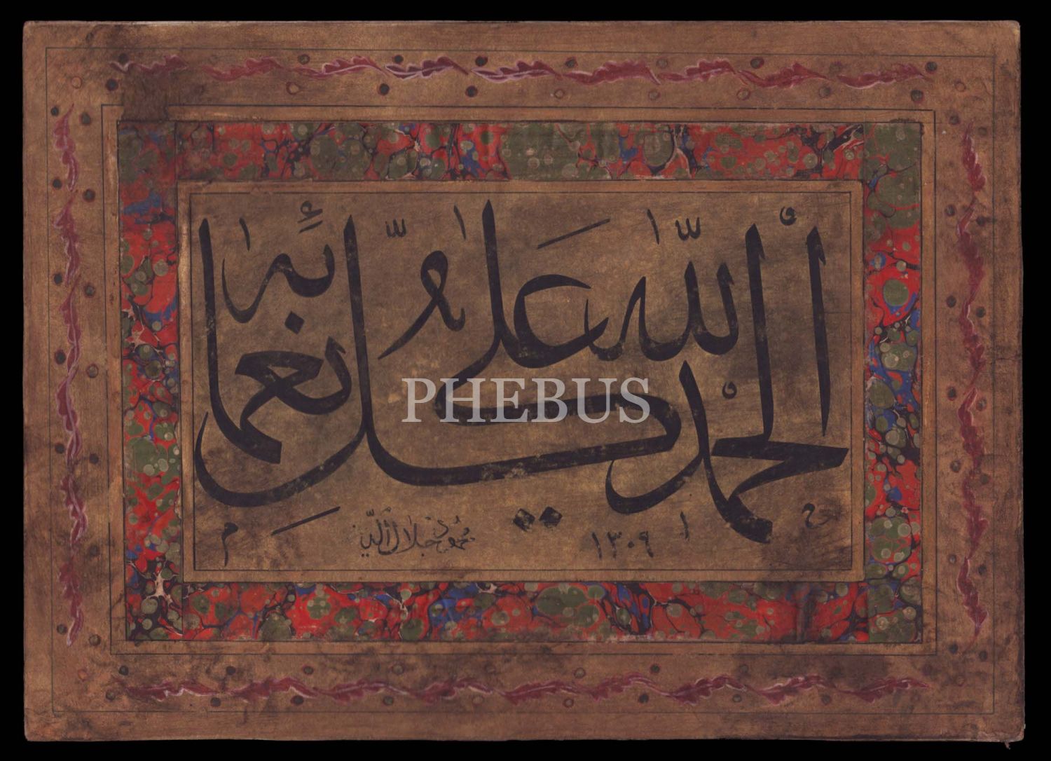 1309 tarihli celi sülüs yazı, paspartusuyla 35x25 cm...