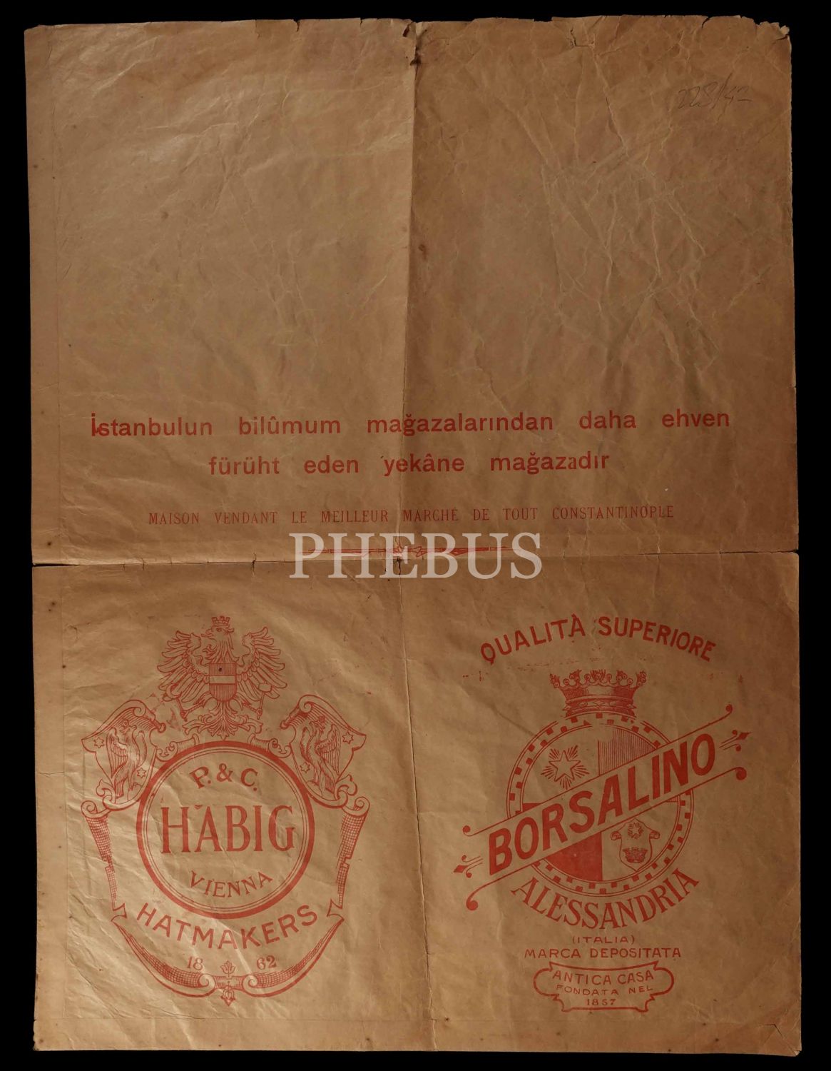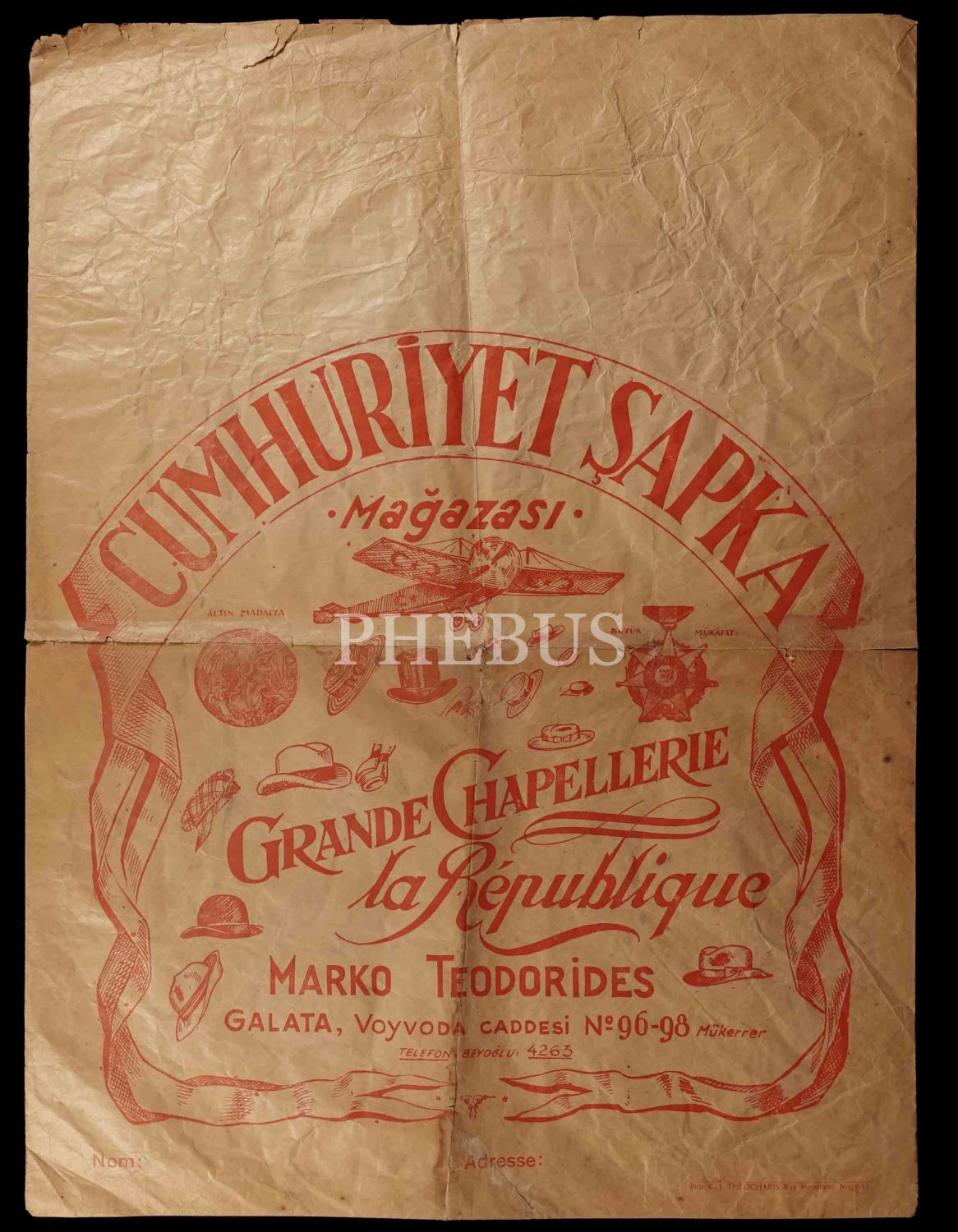 Erken Cumhuriyet döneminden, Cumhuriyet Şapka Mağazası (Marko Teodorides - İstanbul) reklamlı kese kağıdı, 44x58 cm...