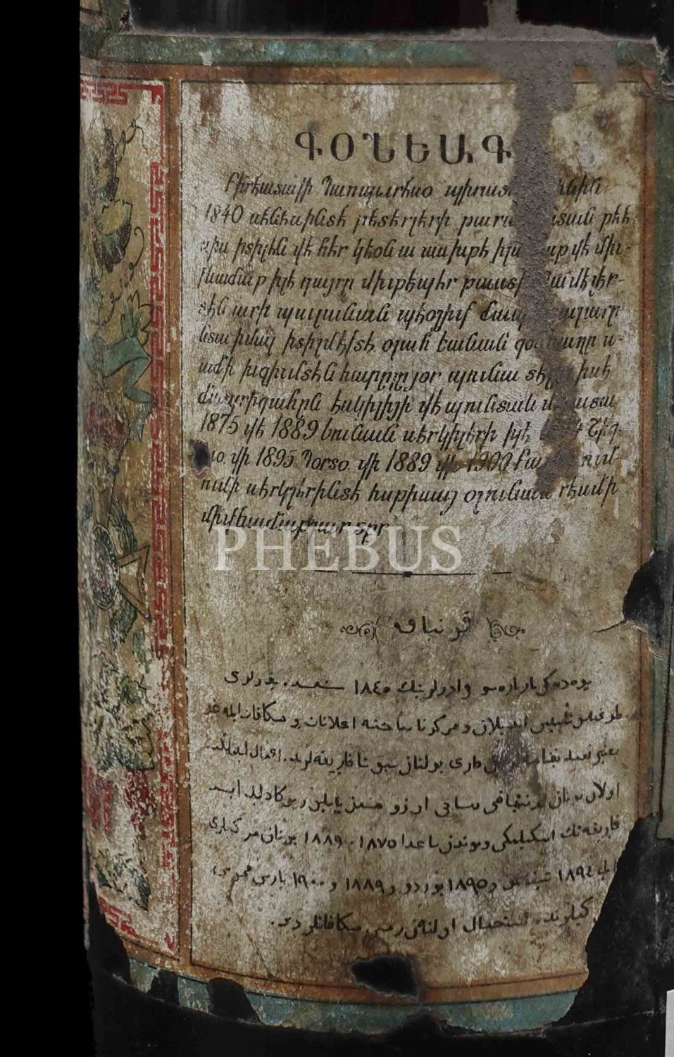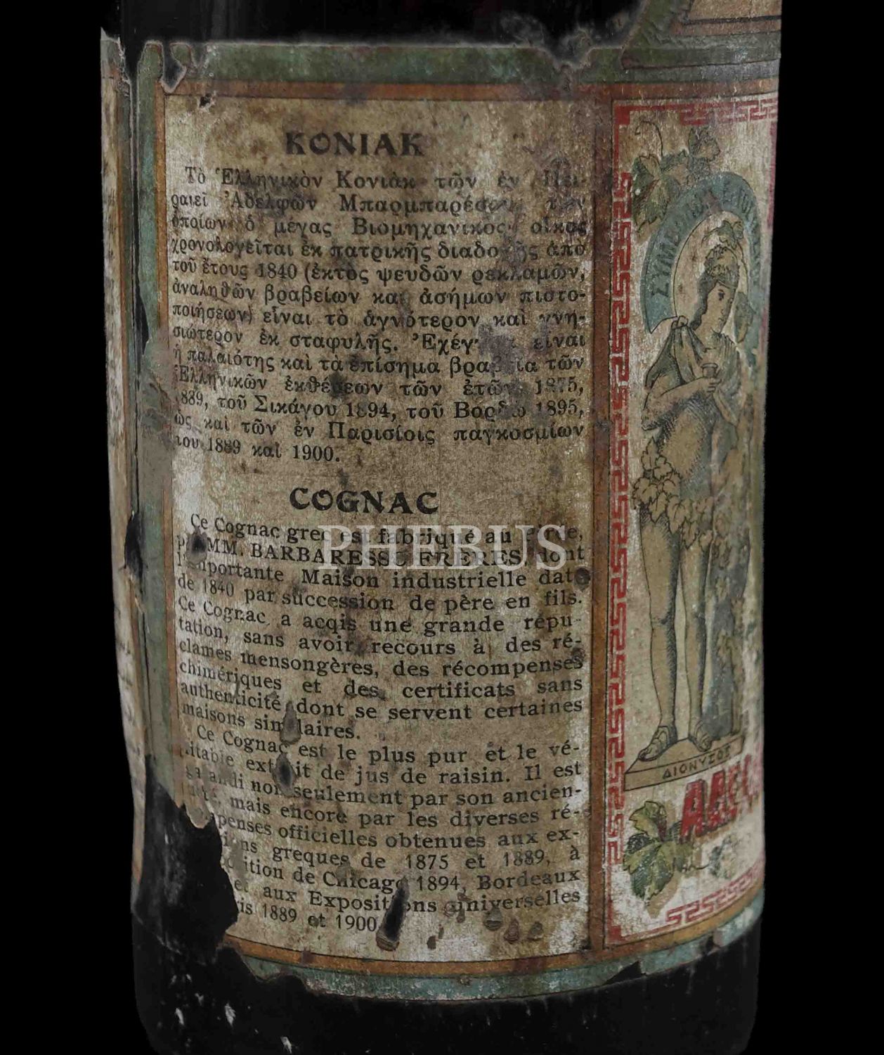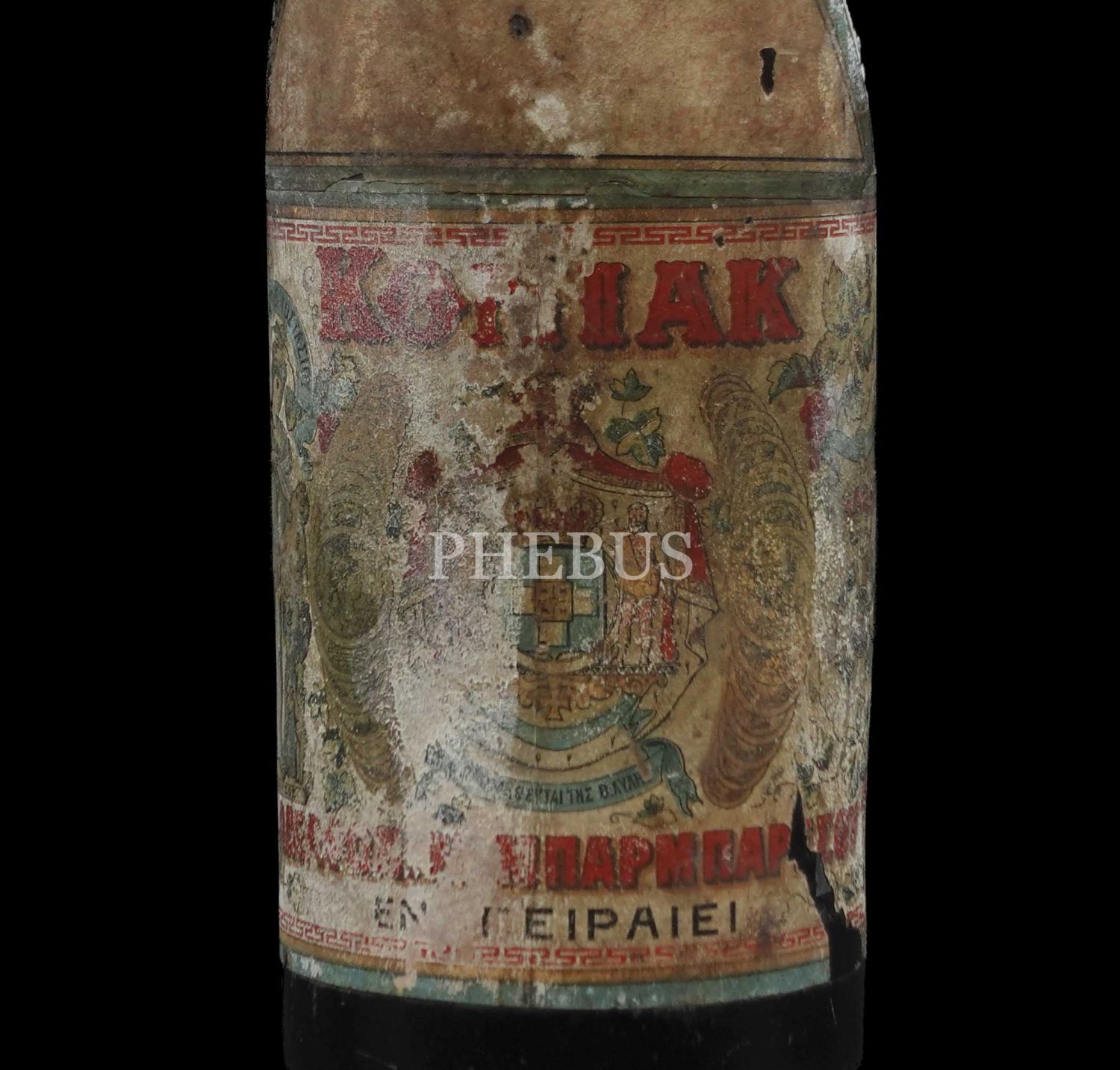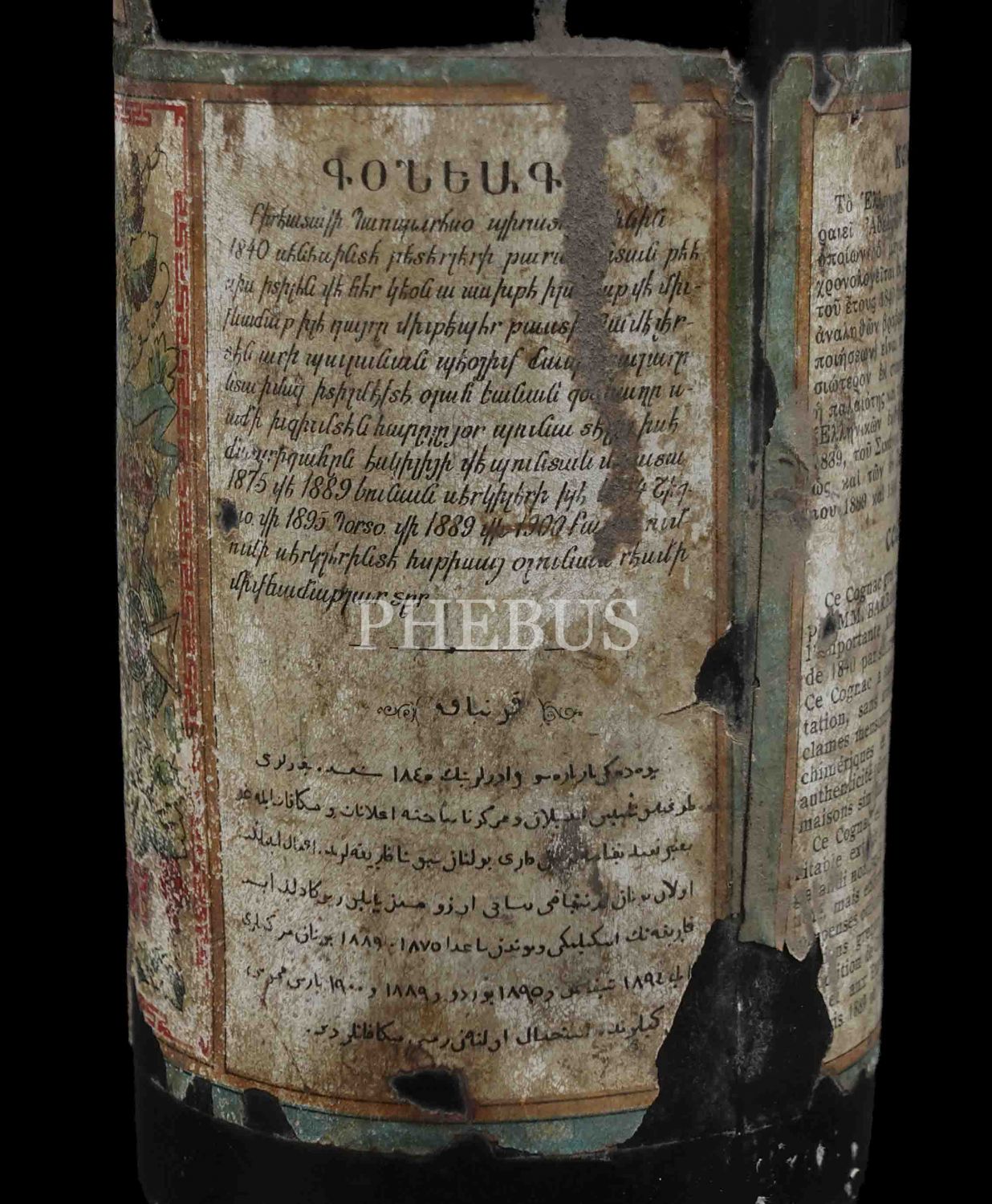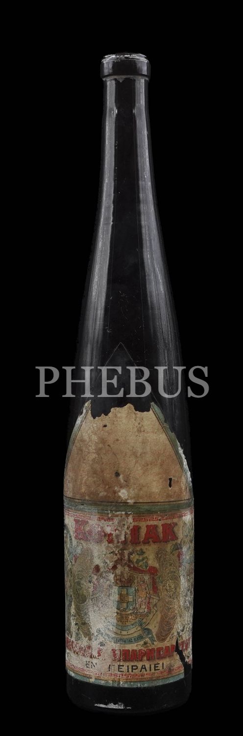 Üzerinde dört dilli etiketi ile Osmanlı döneminden kalma konyak şişesi, Osmanlıca, Rumca, Fransızca ve Ermenice, 37 cm...