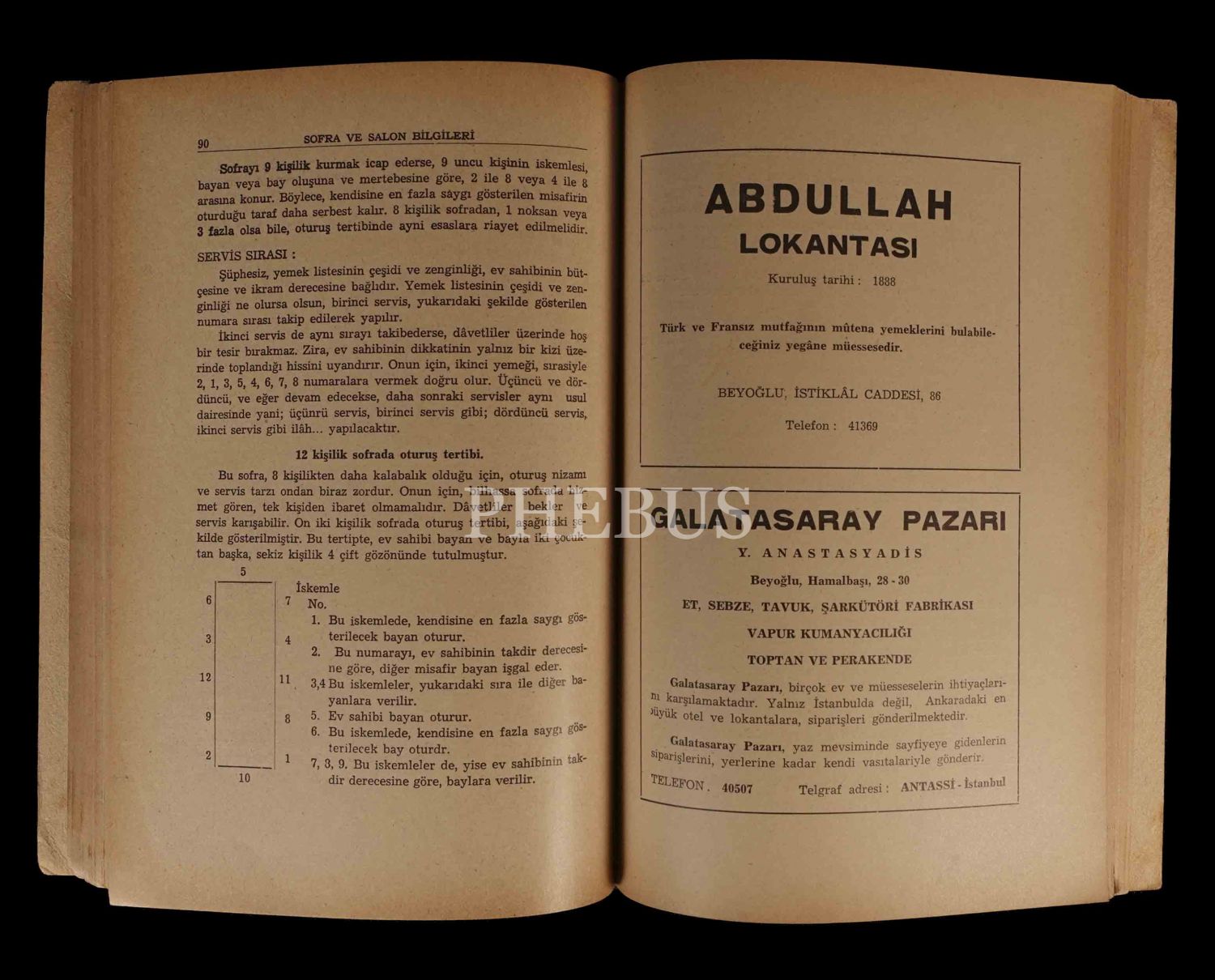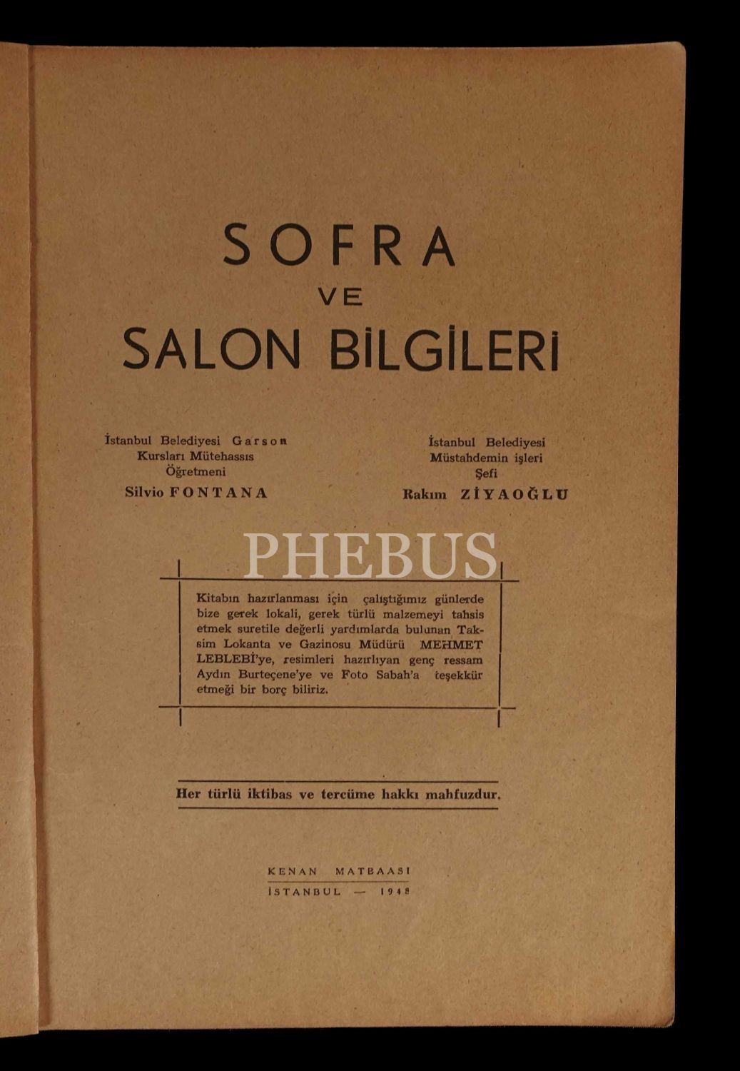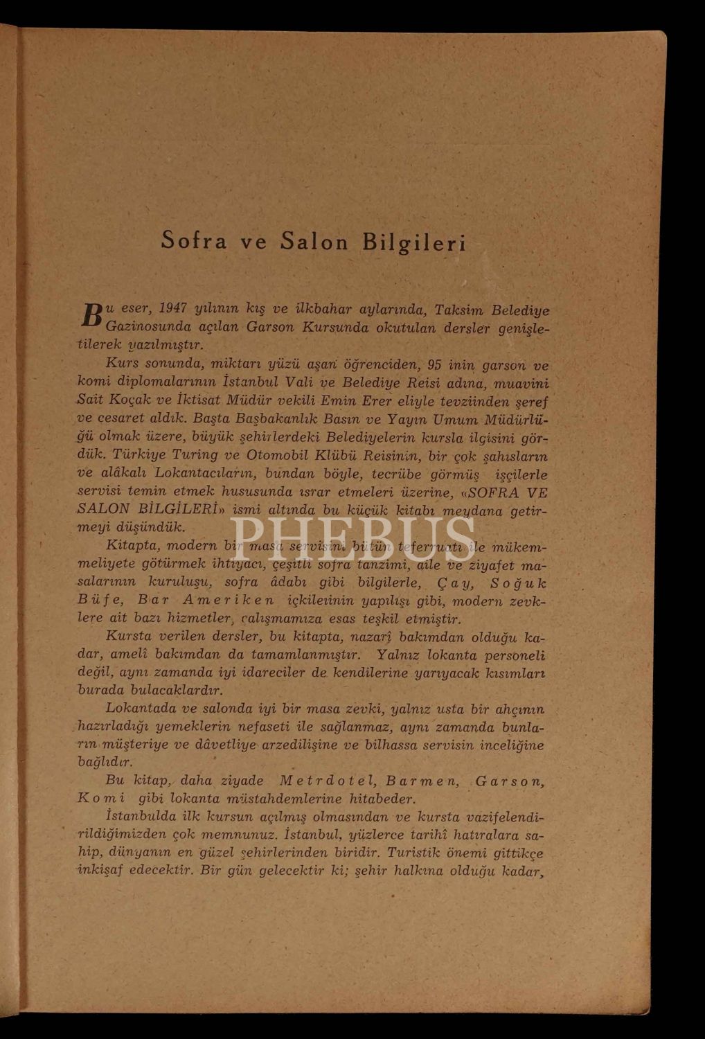 İstanbul Belediyesi Garson Kursları öğretmeni Silvio Fontana ve İstanbul Belediyesi Müstahdemin İşleri şefi Rakım Ziyaoğlu tarafından kaleme alınan eserde garson ve komilerin görünüşünden, sofraların çeşitlerine göre nasıl kurulması gerektiğinden, içkilerin servisinden ve sofra adabından bahsedilmiştir.