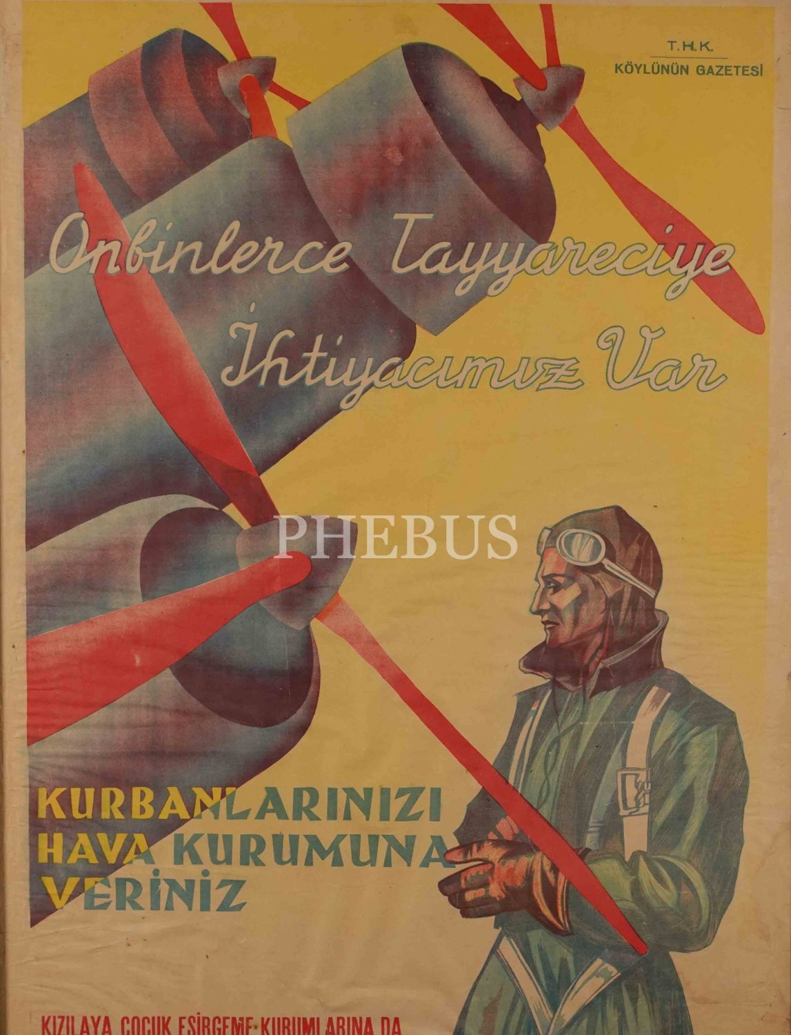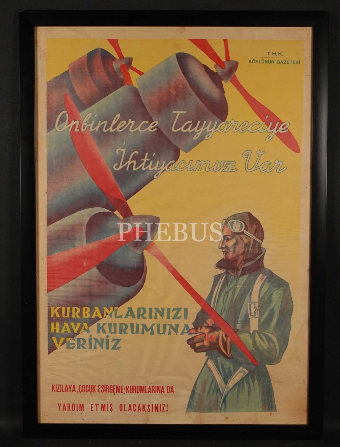 "Onbinlerce Tayyareviye İhtiyacımız Var" yazılı ve kurbanların Türk Hava Kurumu yararına bağışlanması konulu afiş, çerçevesiyle birlikte 62x87 cm...