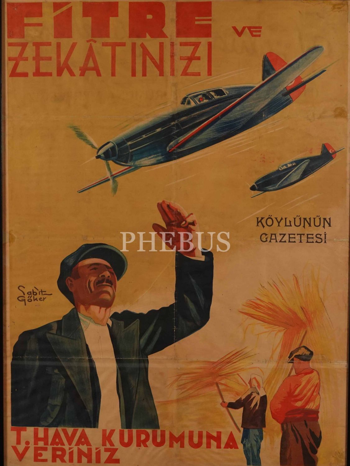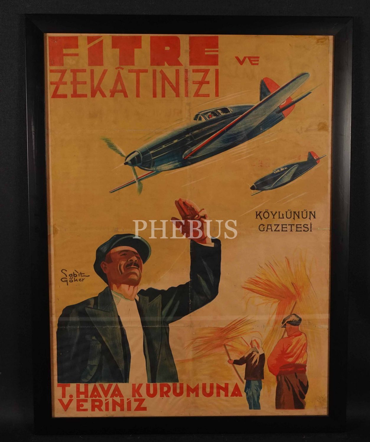 Tasarımını Sabit Göker´in yaptığı "Fitre ve Zekatınızı T. Hava Kurumu´na Veriniz" yazılı afiş, çerçevesiyle birlikte 56x74 cm...