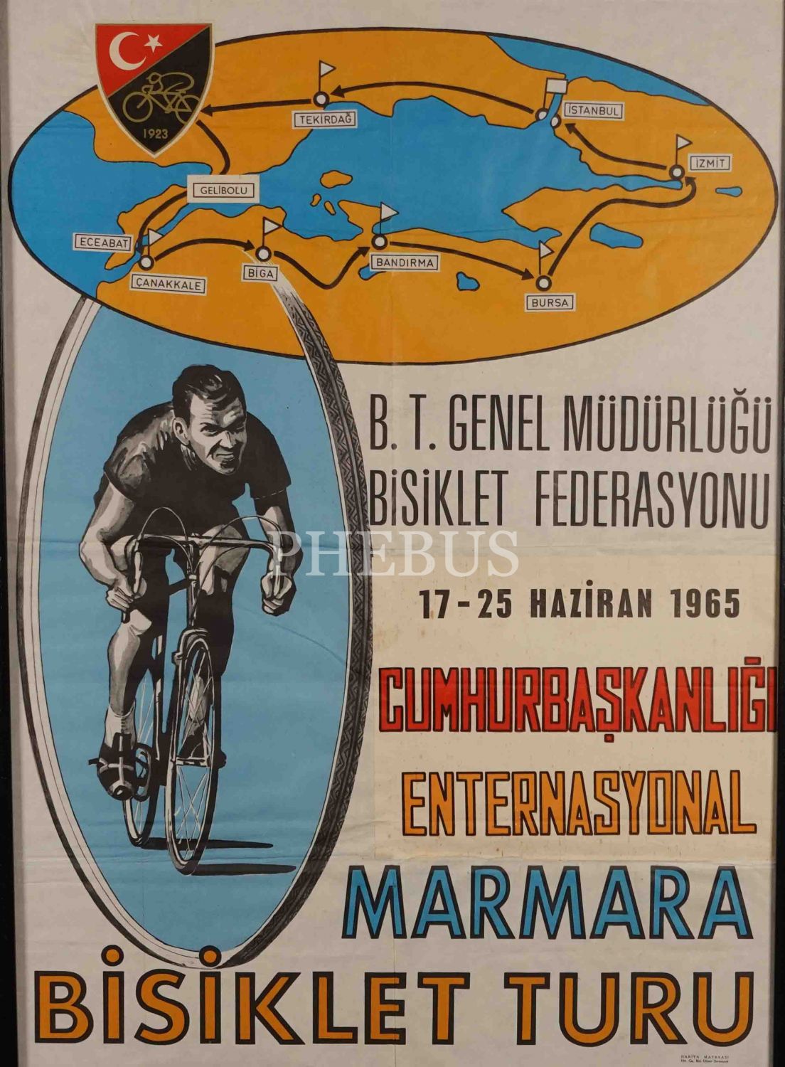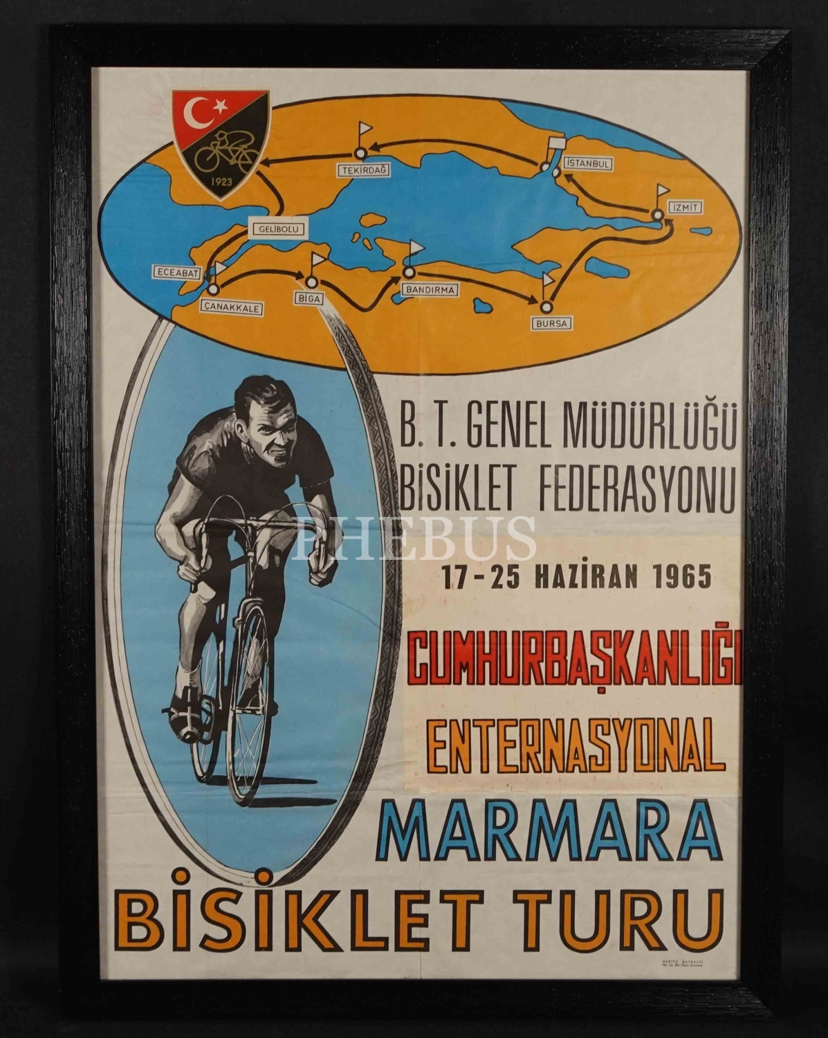 B.T. Genel Müdürlüğü Bisiklet Federasyonu´nun 17 Haziran ile 25 Haziran 1965 tarihinde gerçekleştirdiği "Cumhurbaşkanlığı Enternasyonel Marmara Bisiklet Turu" afişi, Harita Matbaası, çerçevesiyle birlikte 54x75 cm...