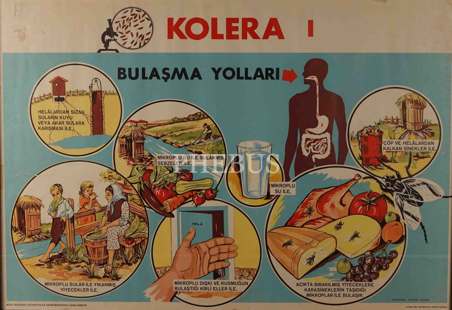 Milli Eğitim Bakanlığı Film-Radyo-Televizyon İle Eğitim Merkezi tarafından yayımlanan "Kolera I: Bulaşma Yolları" başlıklı sağlık afişi, hazırlayan: Nebahat Yıldırım, Ajans-Türk Matbaacılık Sanayi, 102x73 cm...