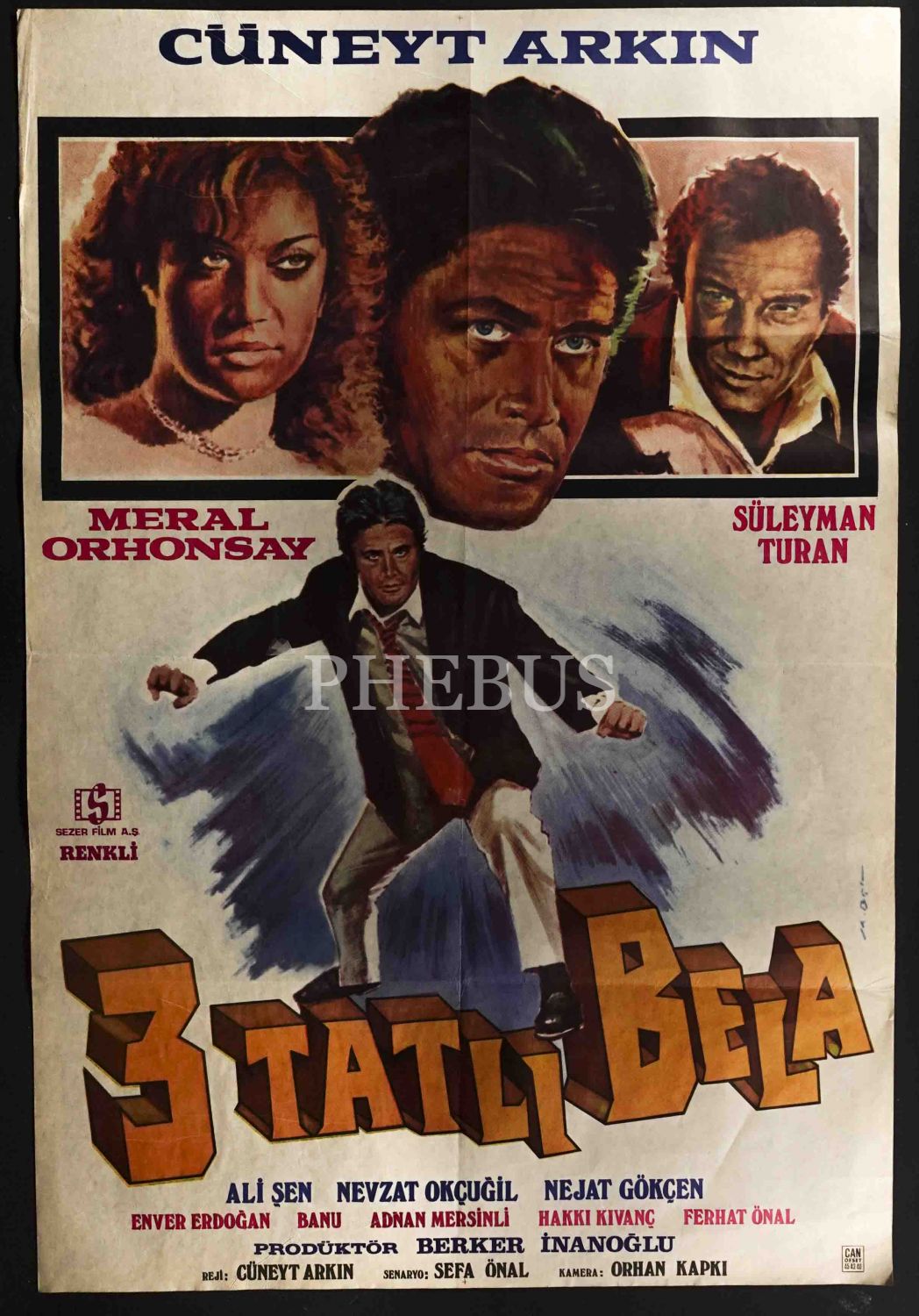 Başrolünü Cüneyt Arkın´ın üstlendiği 3 Tatlı Bela filminin afişi, Sezer Film, 68x99 cm...