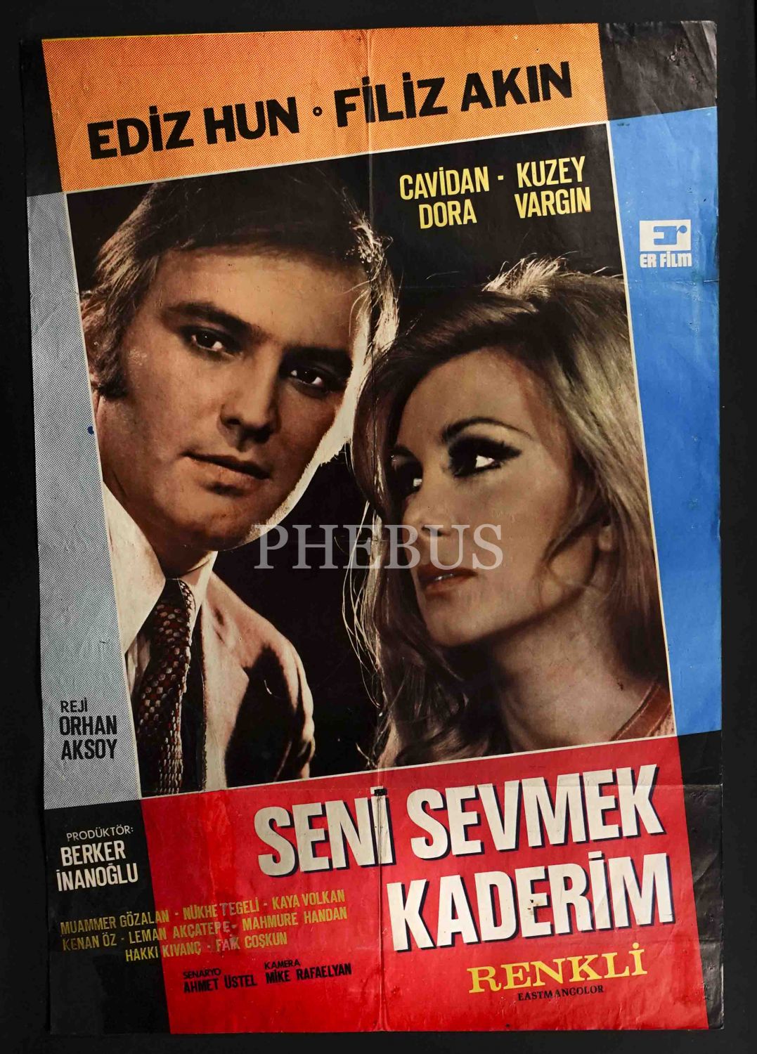 Başrollerini Ediz Hun ile Filiz Akın´ın üstlendiği Seni Sevmek Kaderim filminin afişi, Er Film, 68x99 cm...