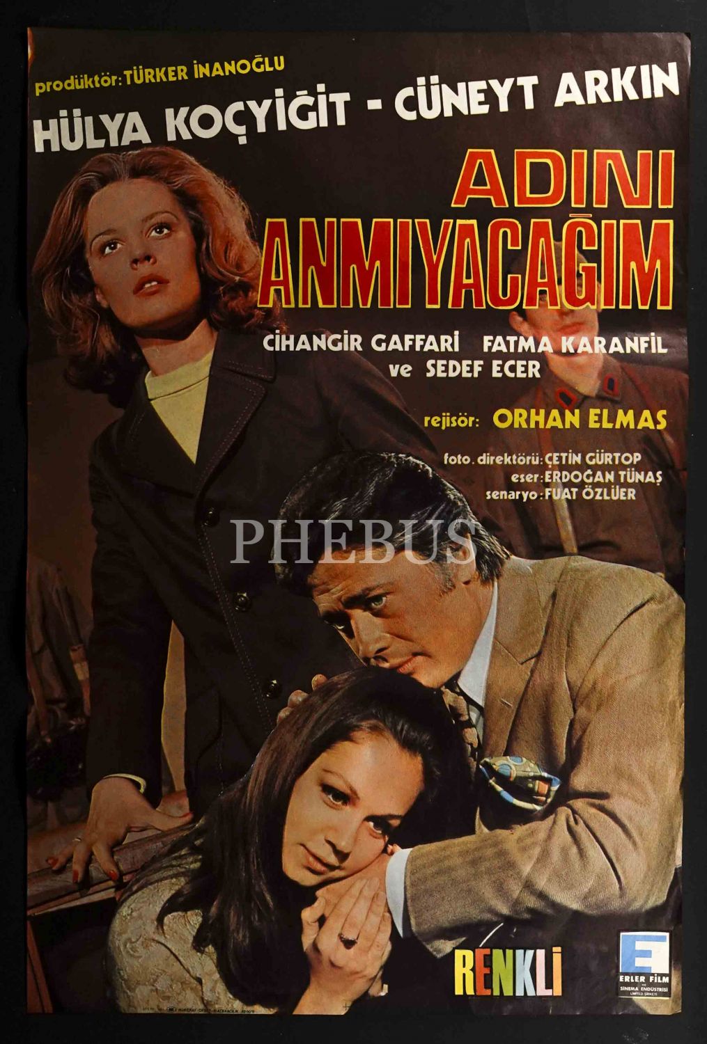 Başrollerini Cüneyt Arkın ile Hülya Koçyiğit´in üstlendiği Adını Anmayacağım filminin afişi, Erler Film ve Sinema Endüstrisi Limited Şirketi, 68x99 cm...