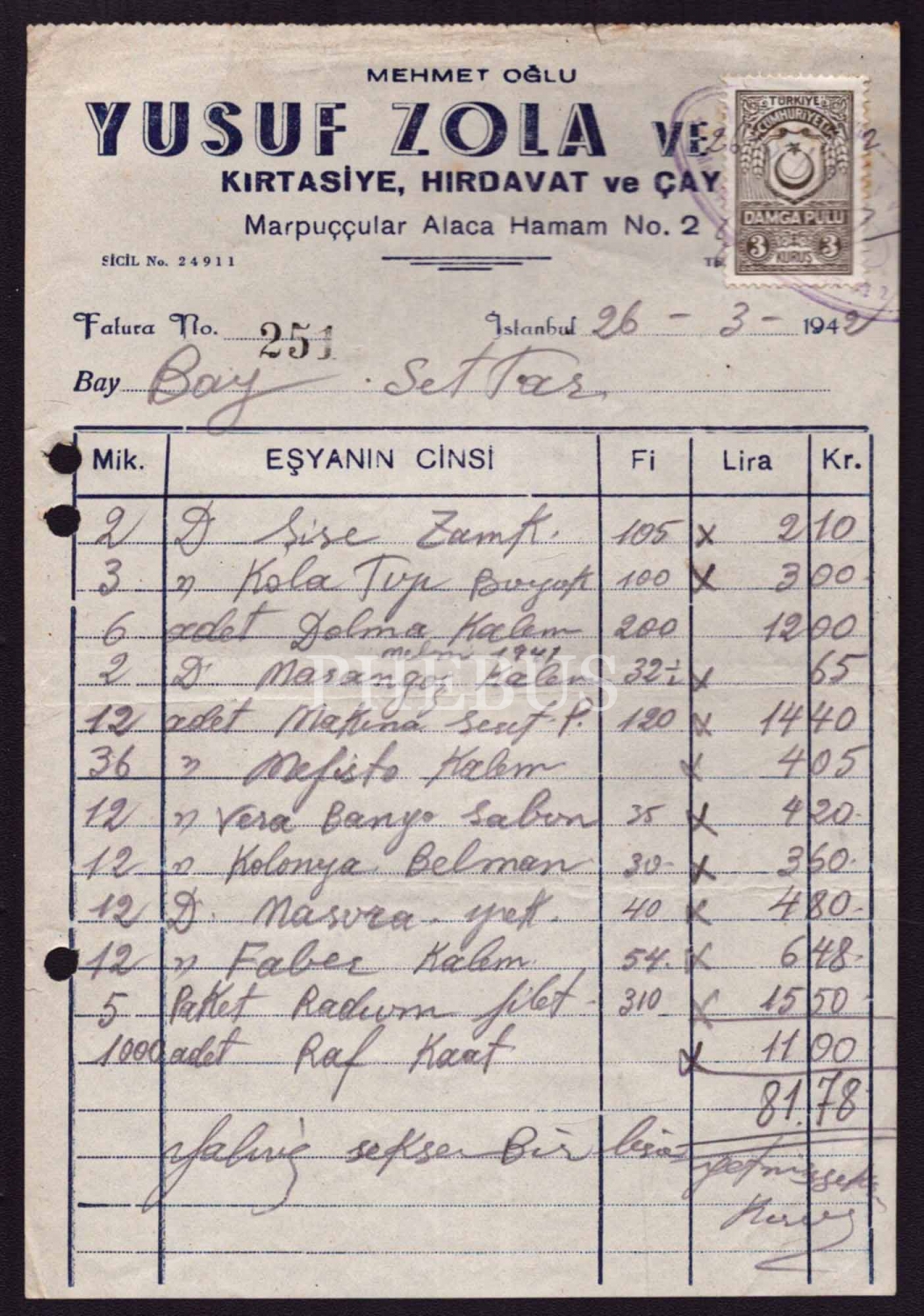 Mehmetoğlu Yusuf Zola ve Şeriki - Kırtasiye, Hırdavat ve Çay - İstanbul antetli, 1942 tarihli fatura, Geredeli Bay Settar Sevim´e kesilmiş...
