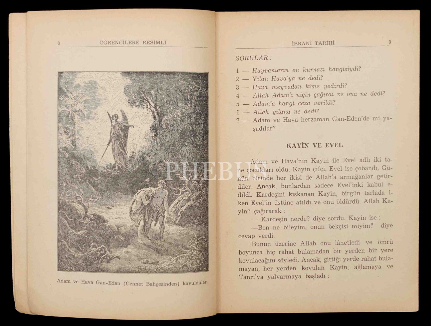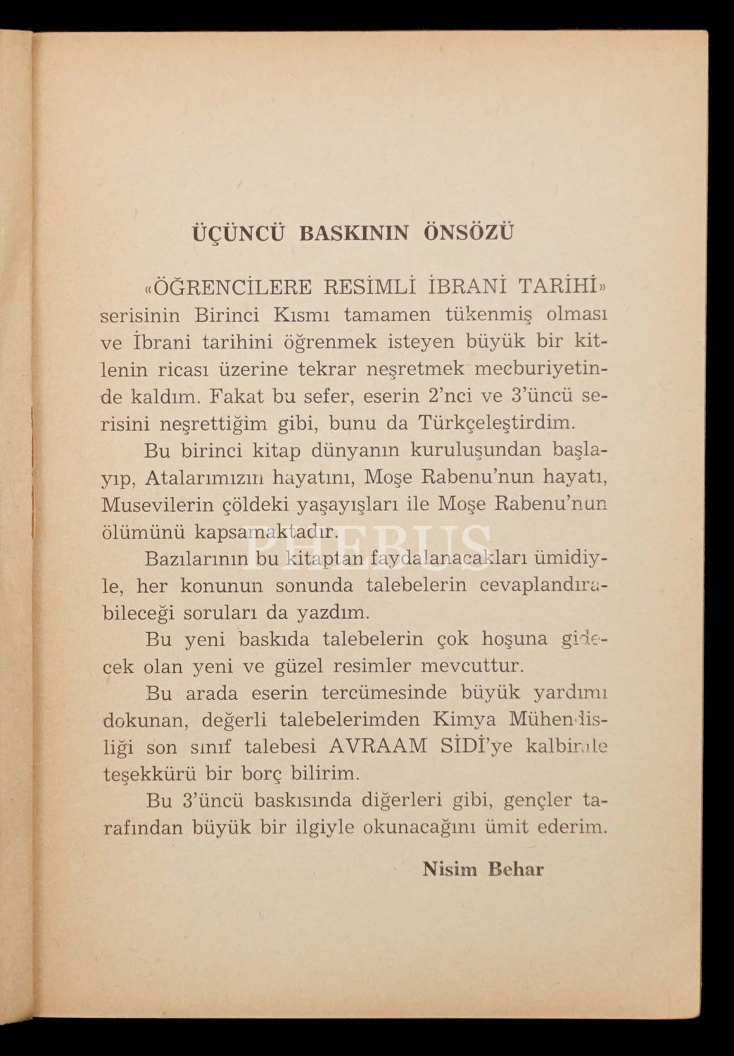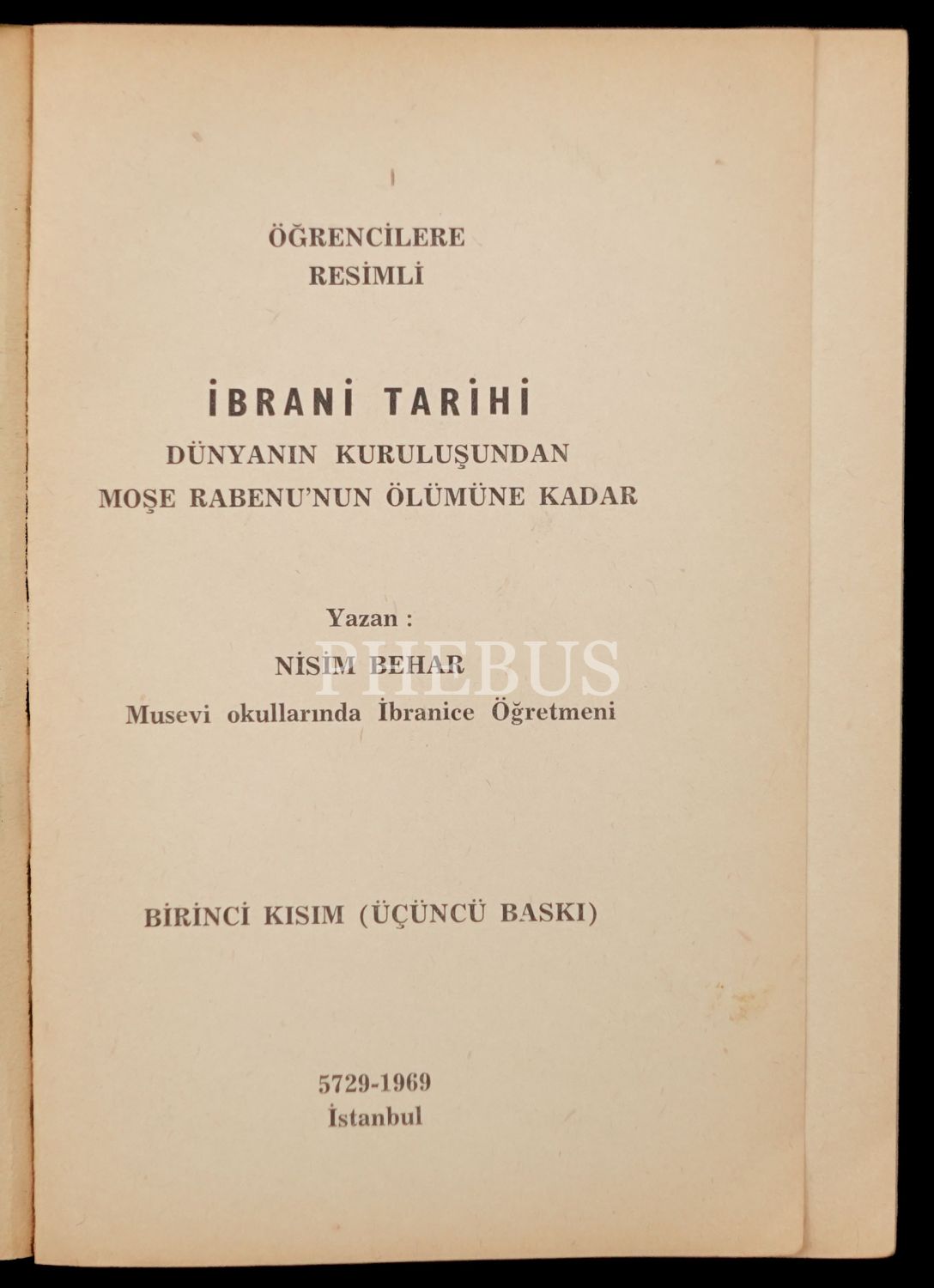 ÖĞRENCİLERE RESİMLİ İBRANİ TARİHİ, Dünyanın kuruluşundan Moşe Rabenu´nun (Musa Peygamber) Ölümüne kadar, Nisim Behar, 1. kısım, İstanbul ahmet Sait Matbaası 5729-1969, 3. baskı, 100 sayfa...