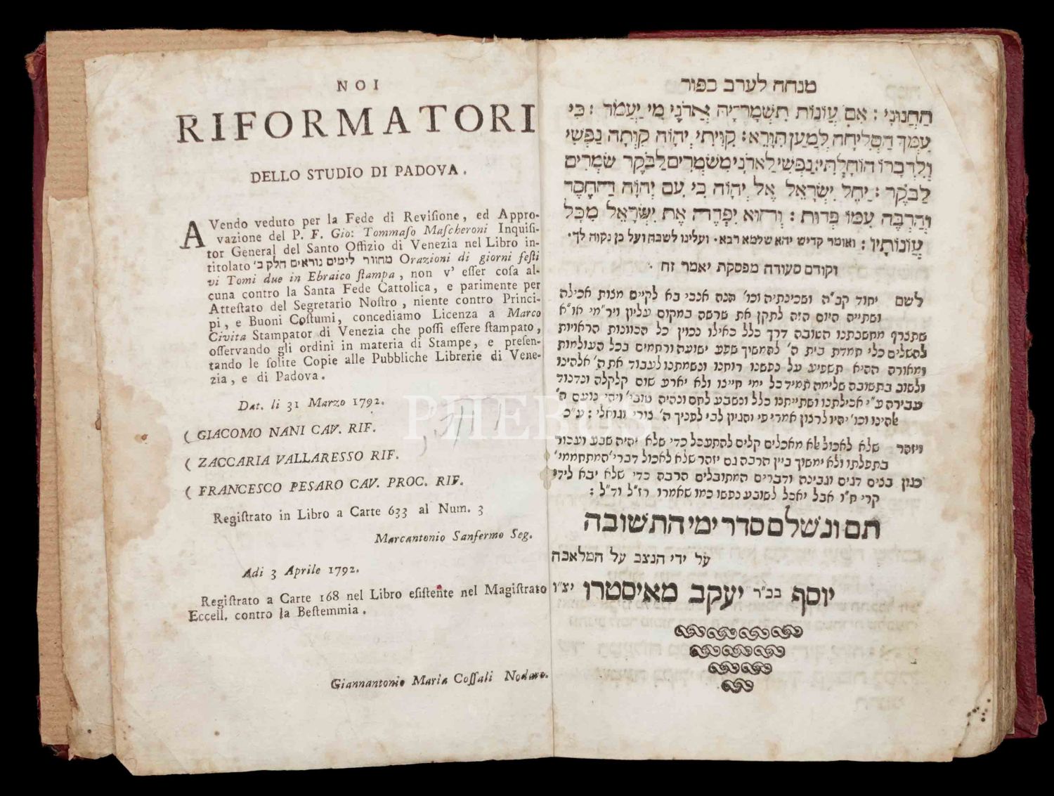 İbranice duaların yanı sıra eski haflerle Ladino izahatli. Döneminin eğitim kurumu olan Padova Üniversitesi sayfası mevcuttur. 12x18 cm...