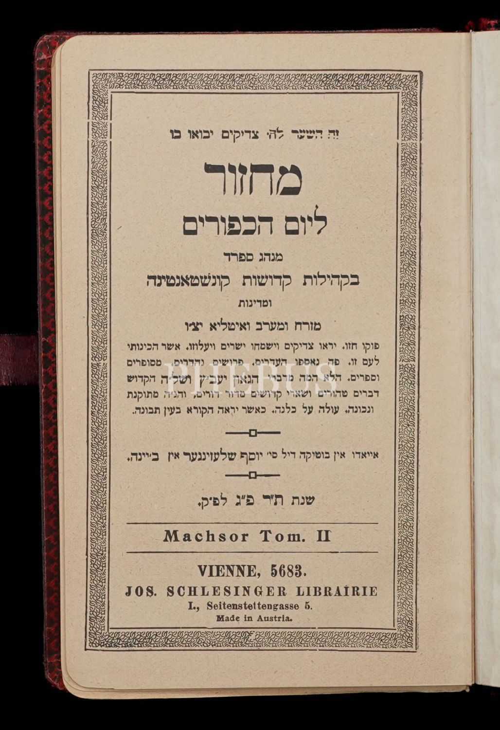 Constantinople ve Doğu ile Batı İtalya Sefarad adetlerine göre Kefaret Günü Yahudi dua kitabı. Altın yaldızlı özel cildinde, yaprak kenarları altın kalemlidir.