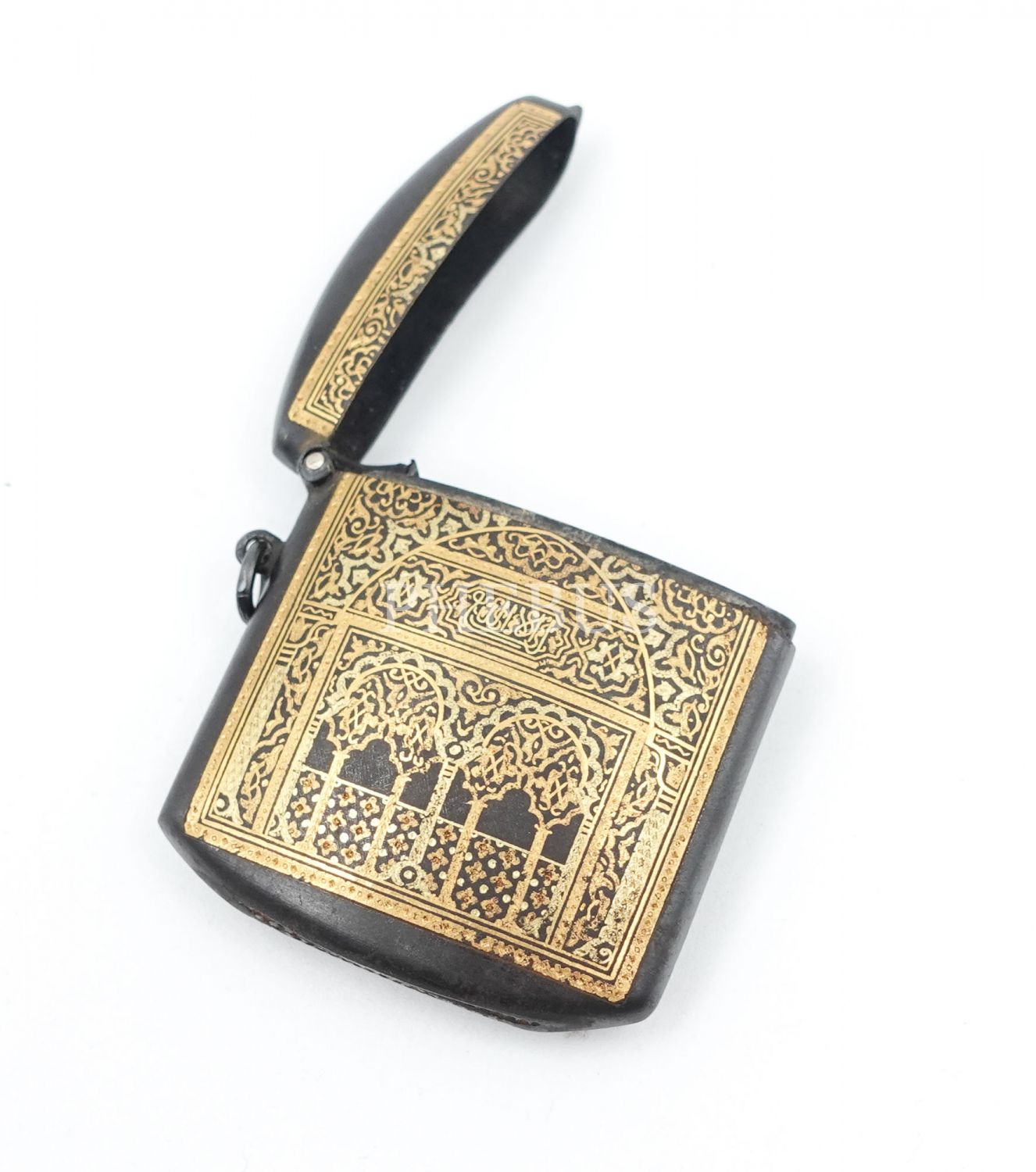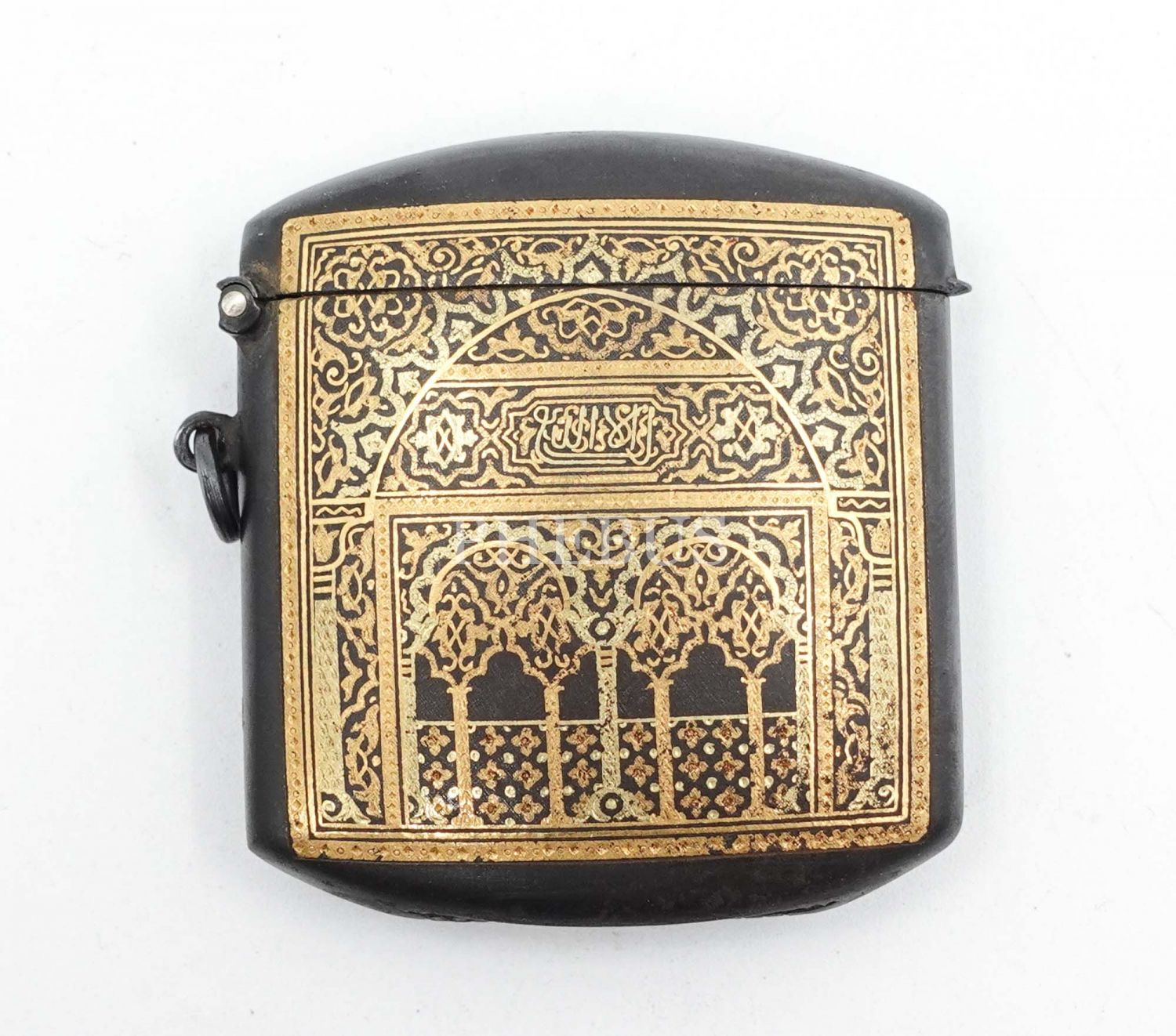 Altın kakma metal Kur´an-ı Kerim kutusu, deri kılıfı içerisinde, kutu 5x5 cm, deri kılıfıyla birlikte 6x6 cm...