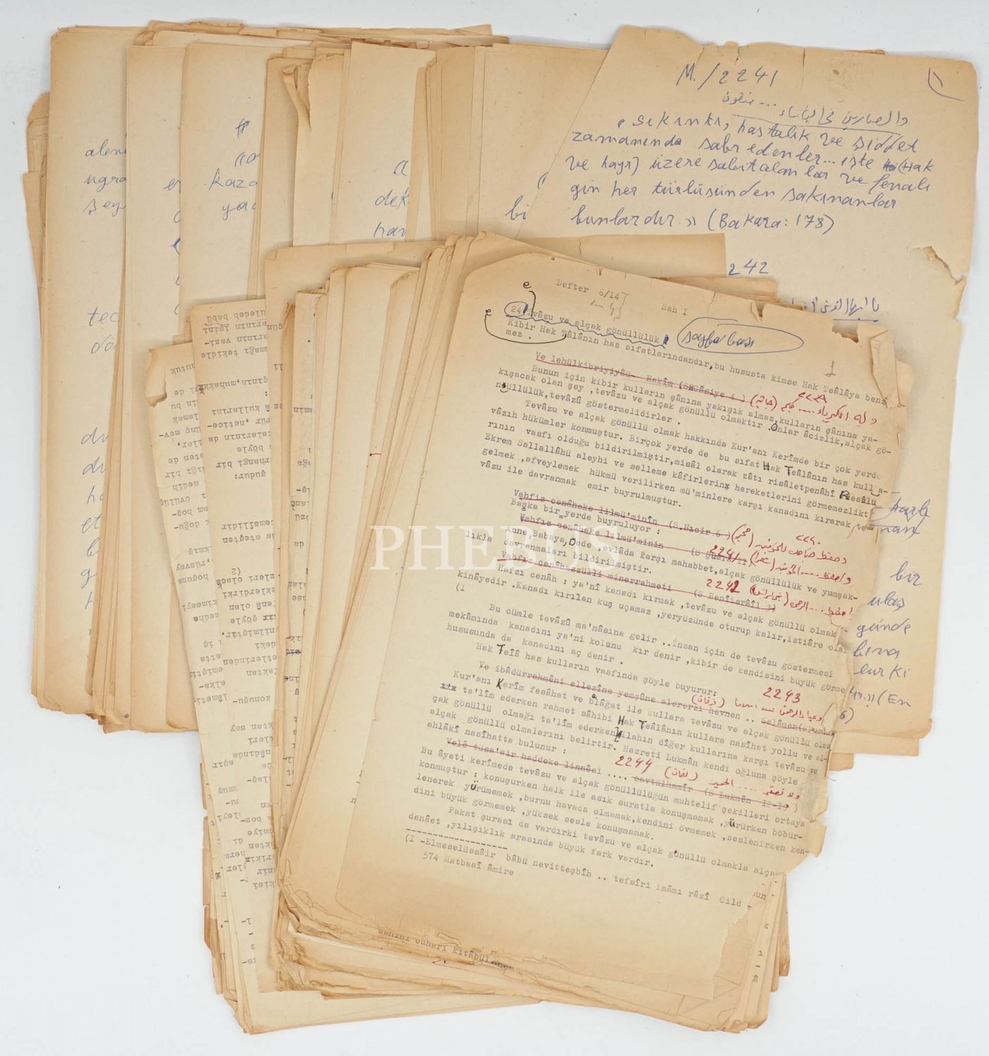 Mehmed Akif Ersoy'un damadı, Latin harfleriyle basılan ilk Türkçe KUR´ÂN-I KERÎM tercümelerinden biri olan TANRI BUYRUĞU´nun yazarı Ömer Rıza Doğrul´un kaleminden el yazısı ve daktilo "meâl" çalışmaları, 101 (el yazısı) + 68 (daktilo) yaprak...