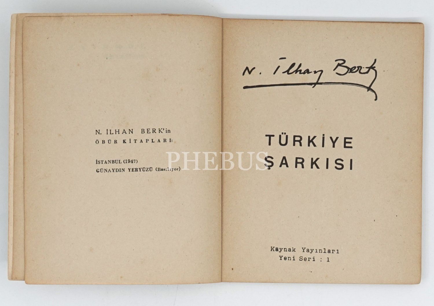 TÜRKİYE ŞARKISI, N. İlhan Berk, 1947, Kaynak Yayınları, 72 sayfa, 14x16 cm...
