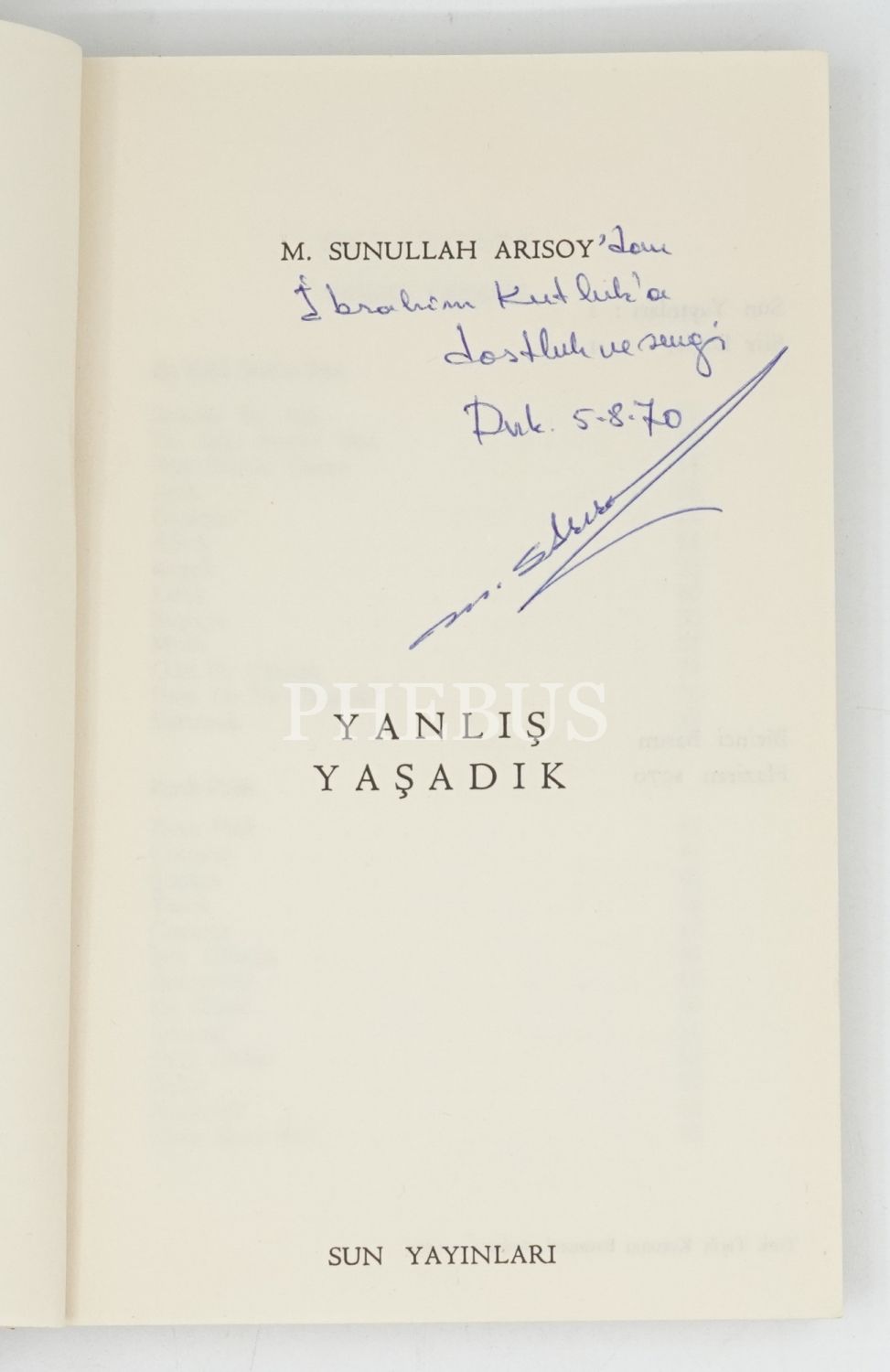 "M. Sunullah Arısoy´dan İ. Kutluk´a dostluk ve sevgi." ithafıyla imzalıdır.