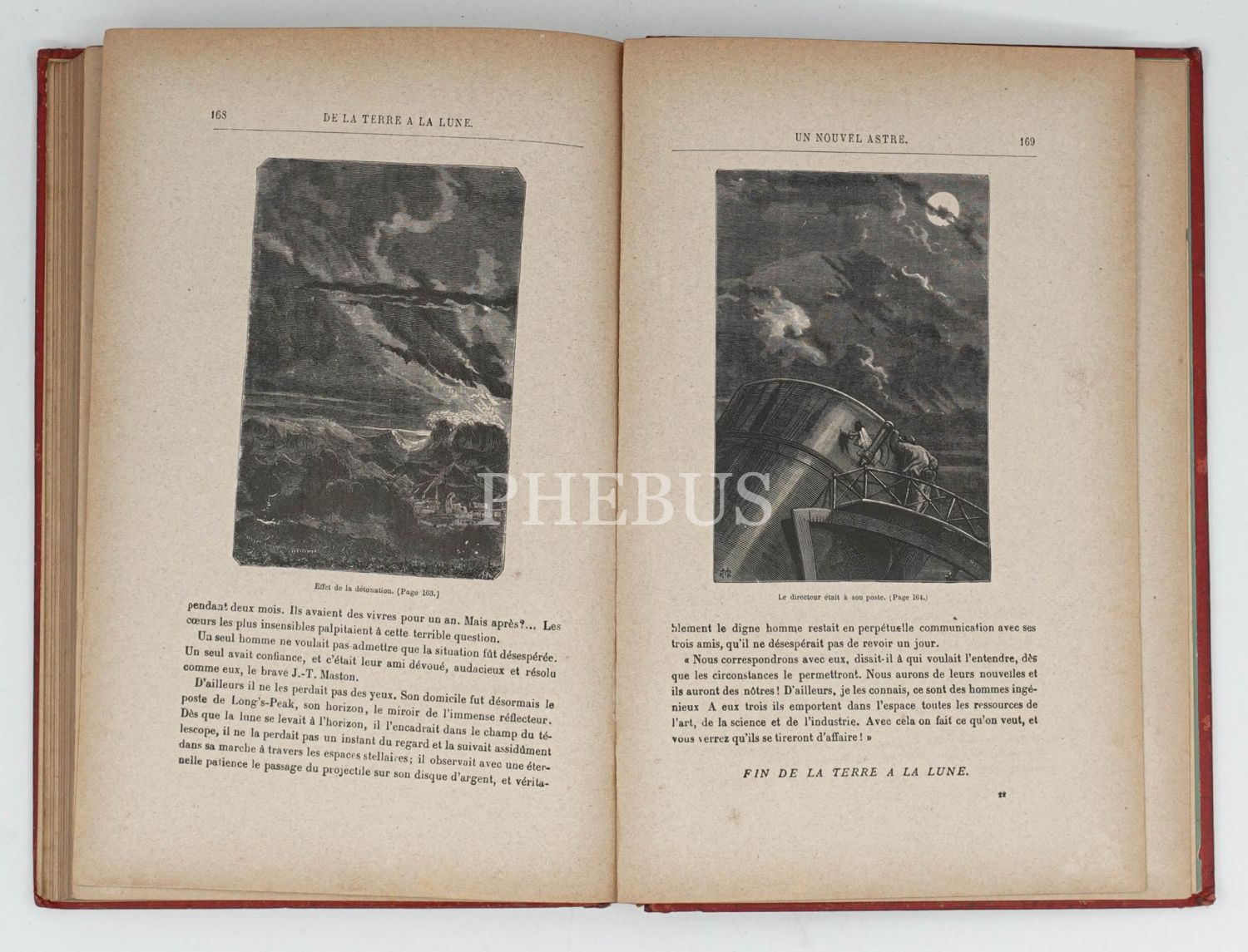 Türkçeye "Ay´a Yolculuk" adıyla çevrilen Jules Verne klasiğinin, siyah-beyaz gravürler eşliğinde Hetzel baskısı. Sayfa kenarları yaldızlı dönem cildinde... Kitabın ön iç kapağında "S.H. Weiss Librairie - Constantinople" yazılı etiket mevcuttur.
