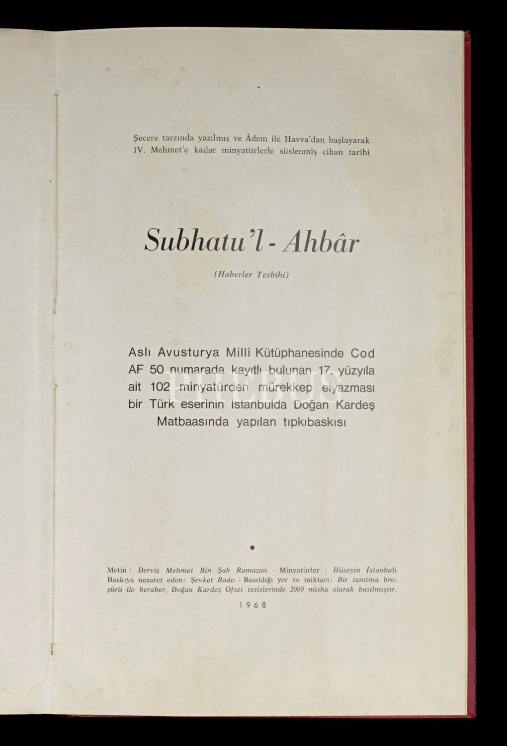 Kanuni Sultan Süleyman devrinde yaşamış Derviş Mehmed´in, Adem ile Havva´dan başlayarak IV. Mehmed´e kadar minyatürle süslediği, cihan tarihine dair şeçere tarzında kaleme aldığı eserdir. Satışa sunulan bu nüsha, aslı Avusturya Milli Kütüphanesi´nde "Cod AF 50" numarada kayıtlı bulunan 17. yüzyıla ait 102 minyatürden mürekkep el yazmasının, Şevket Rado gözetiminde İstanbul´da Doğan Kardeş Matbaası´nda yapılan tıpkıbaskısıdır. Yalnızca 200 adet basılmıştır.