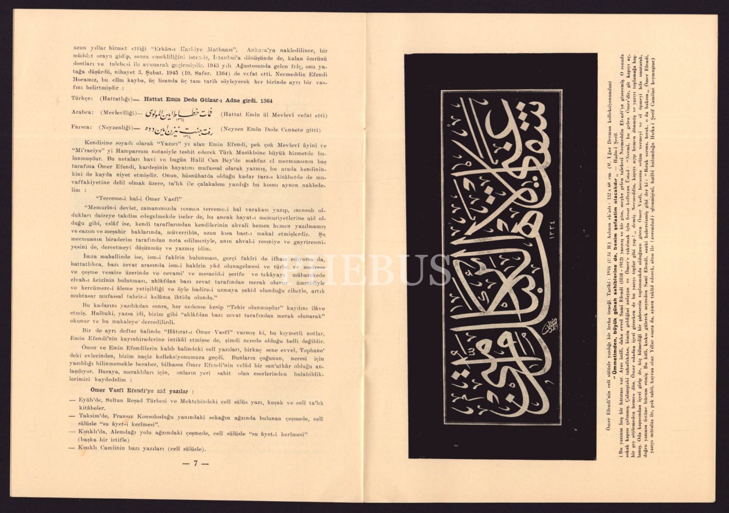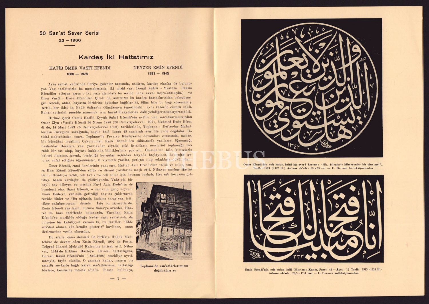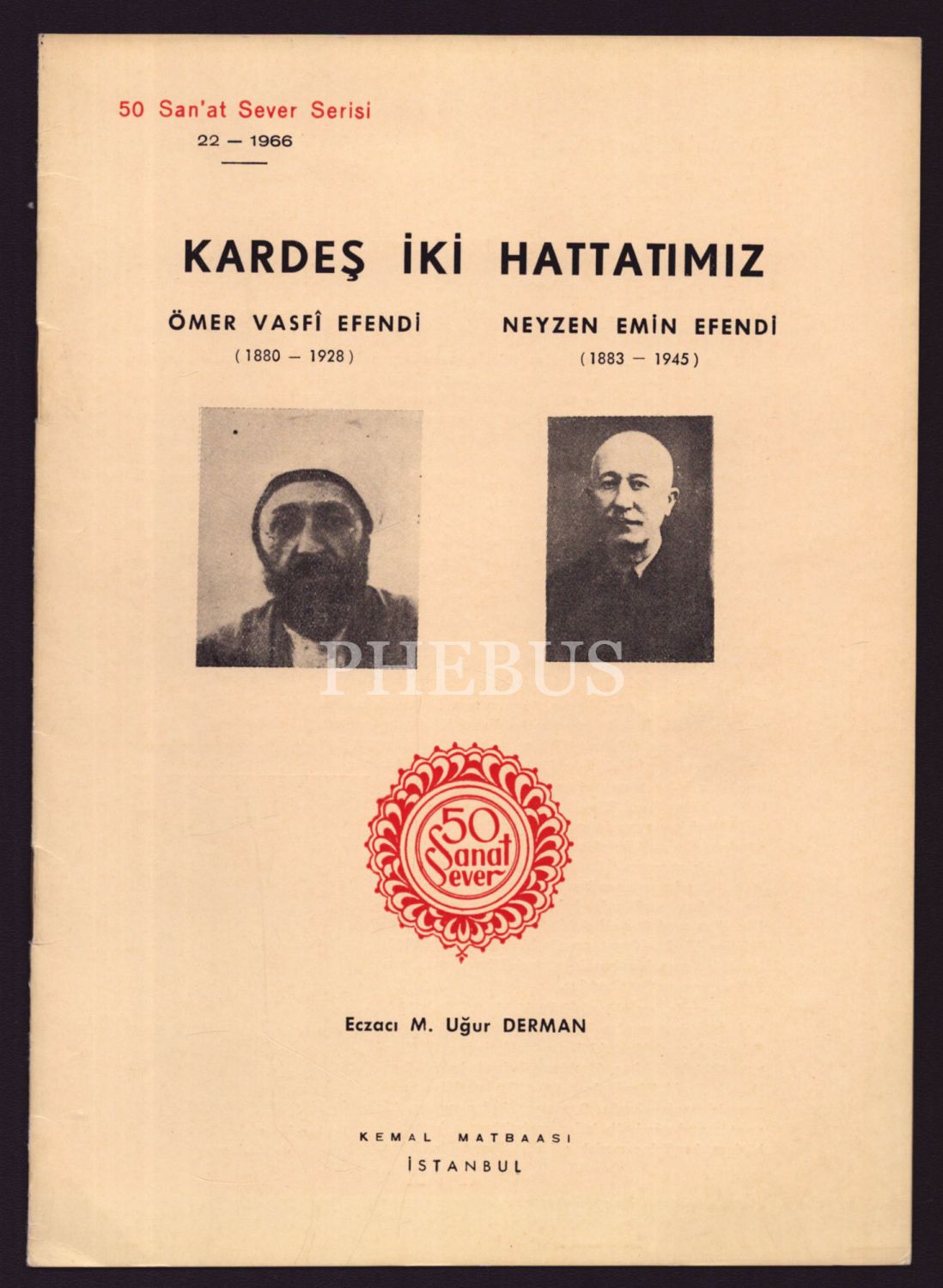 Kardeş İki Hattatımız "Ömer Vasfi Efendi (1880-1928)-Neyzen Emin Efendi (1883-1945)", M. Uğur Derman, 50 Sanat Sever Serisi 22 numara, 1966, 16x23 cm
