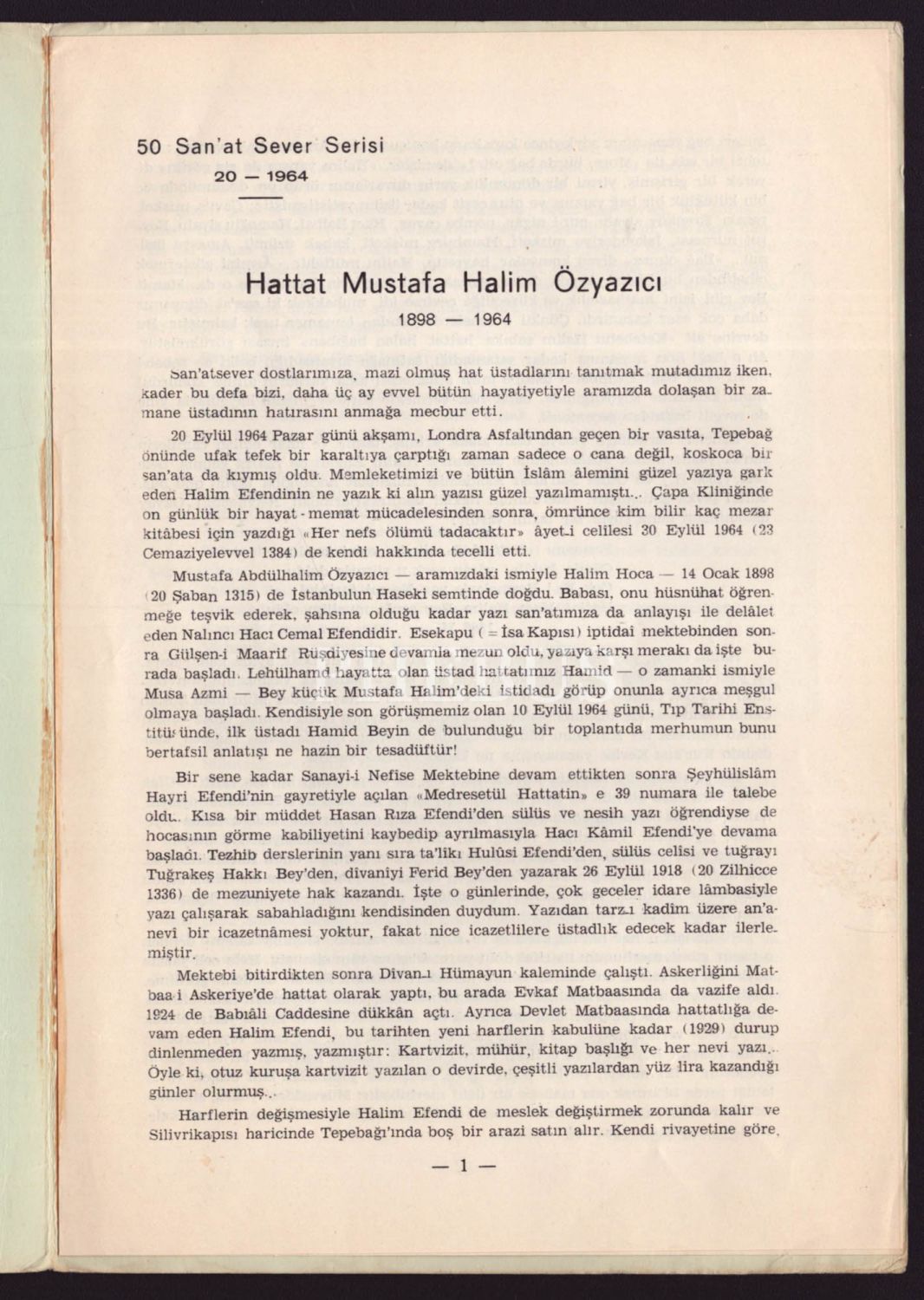 50 Sanat Sever Serisi´nin 1964 tarihli "Hattat Mustafa Halim Özyazıcı Hayatı ve Eserleri" başlıklı 20. sayısı, Uğur Derman, 4 sayfa, 17x25 cm...