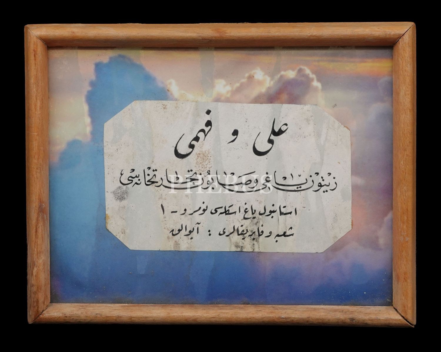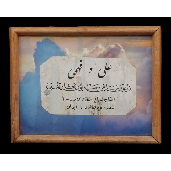 "Ali ve Fehmi Zeytinyağı ve Sabun Ticarethanesi (İstanbul Yağ İskelesi, şube ve fabrikaları: Ayvalık" yazılı tabela, çerçevesiyle birlikte 20x15 cm...