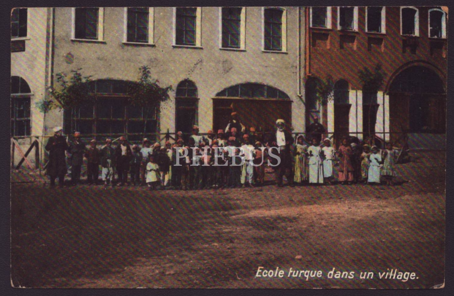 Osmanlı döneminden bir köy okulunun öğrencileri ve öğretmenleri, "Ecole turque dans un village, Constantinople" yazılı, ed. Max Fruchtermann, 14x9 cm...