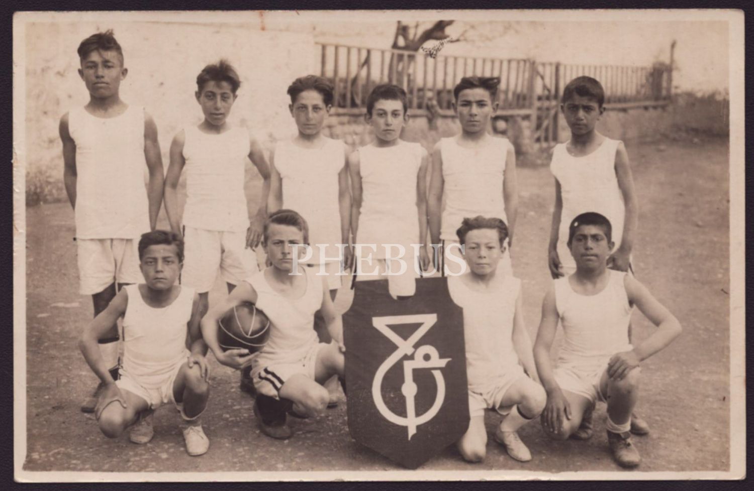 "M.C" yazılı tabelayla poz veren minik basketbol takımının toplu hatıra fotoğrafı, 14x9 cm...
