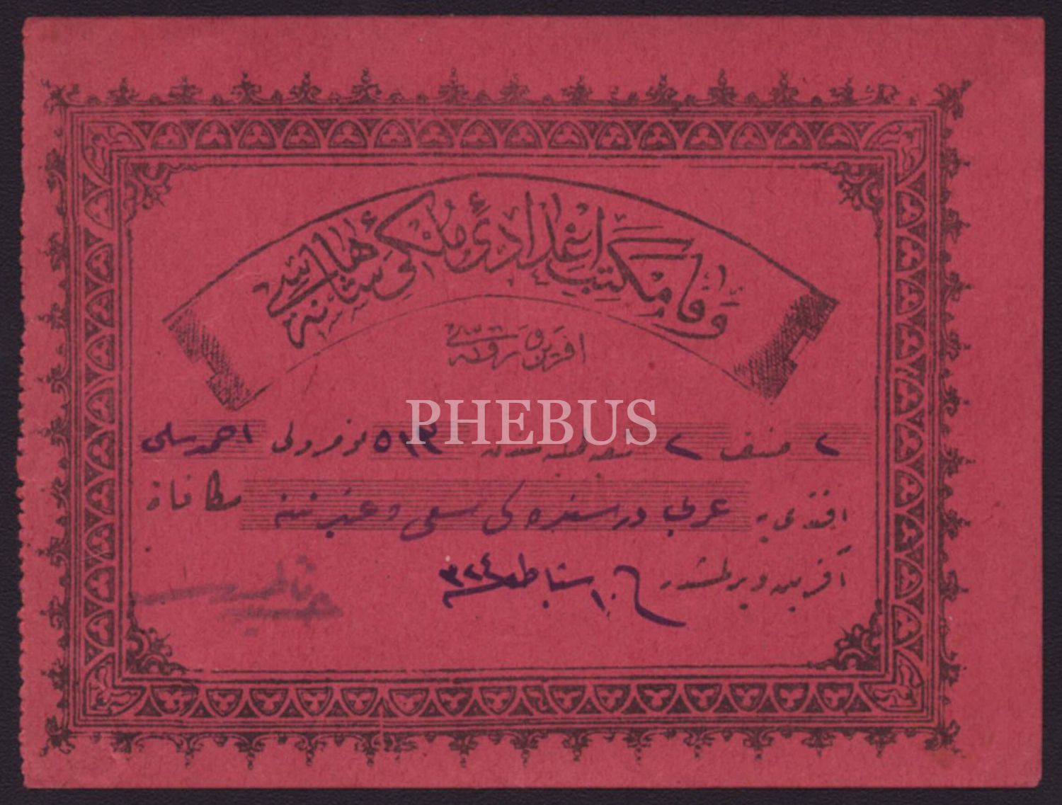 Vefa Mekteb-i Mülkiye-i Şahanesi tarafından Arapça dersinde başarılı olan Ahmed Sami Efendi´ye verilen aferin kağıdı, 11x8 cm...