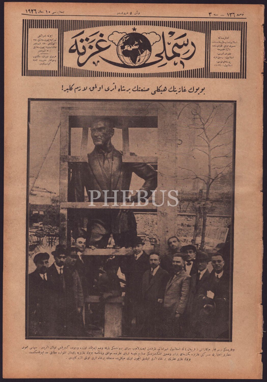 İstanbul Belediyesi tarafından Macar heykeltıraş Krippel´e yaptırılan Sarayburnu Atatürk Anıtı´nın görselini kapağına taşıyan RESİMLİ GAZETE´nin 10 Nisan 1926 tarihli nüshası, 8 sayfa, 28x39 cm...