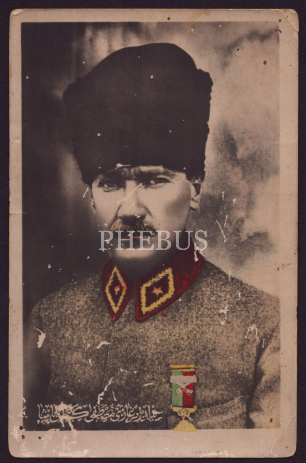 İstiklal madalyalı ve mareşal üniformalı Mustafa Kemal Atatürk fotokartı, "Yıldırım Gazi Mustafa Kemal Paşa" yazılı, 14x9 cm...