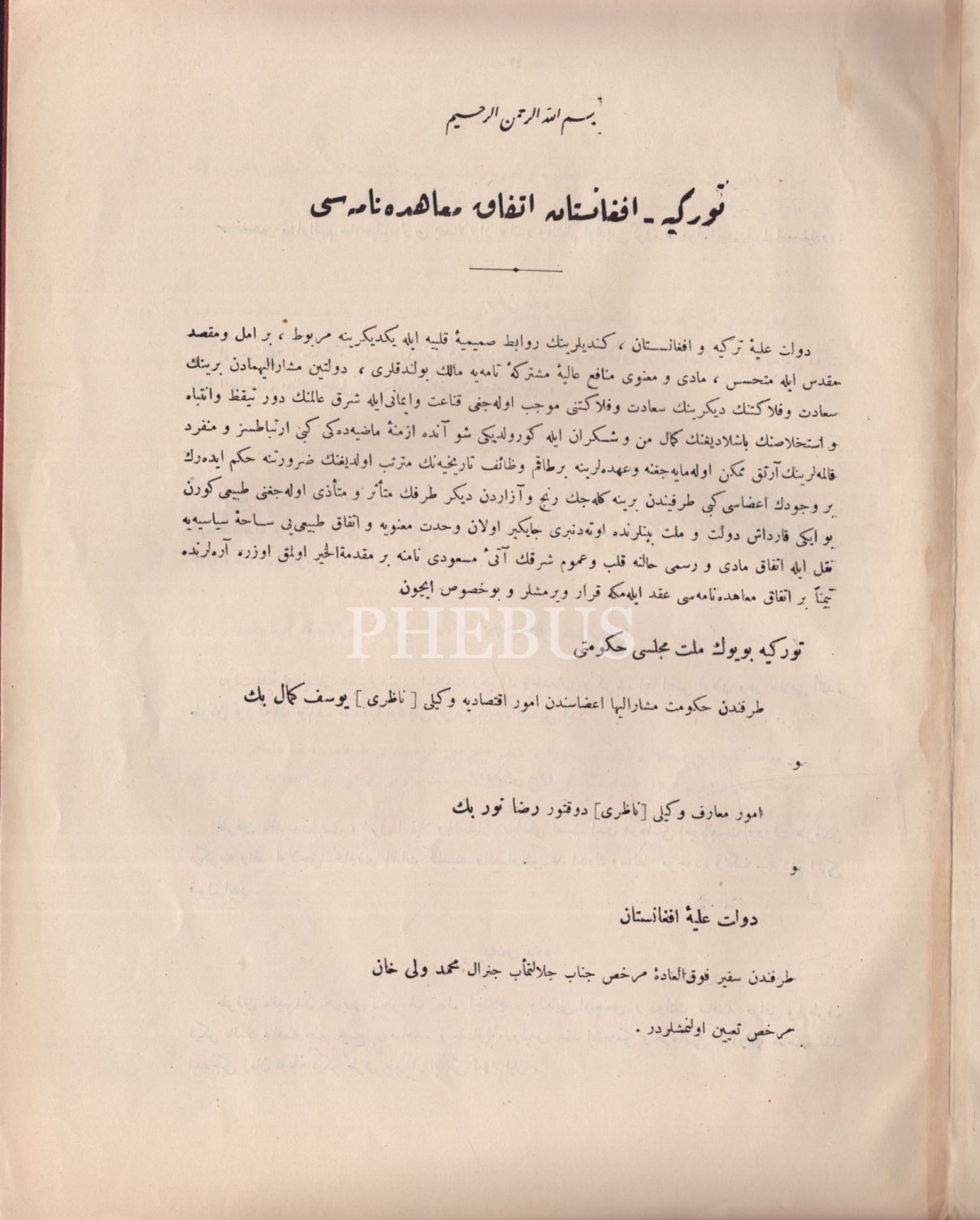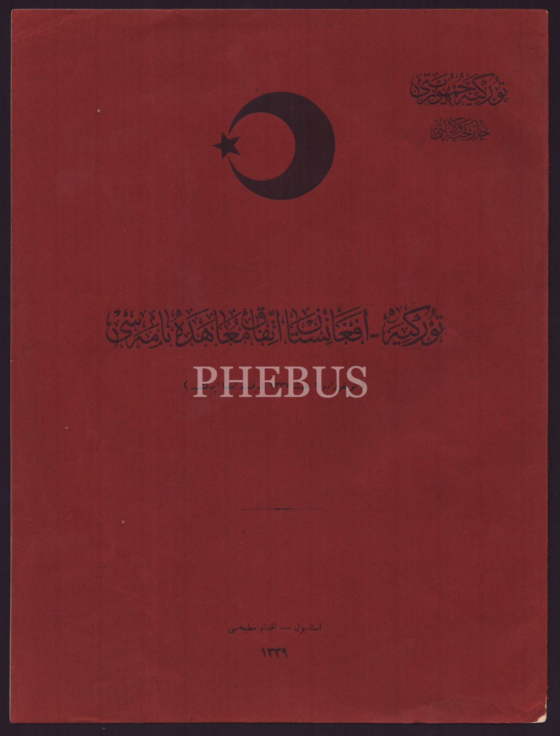 1 Mart 1921 tarihinde Moskova´da imzalanan Türkiye-Afganistan İttifak Muahedenamesi, 1339, İstanbul İkdam Matbaası, 5 sayfa, 23x31 cm...