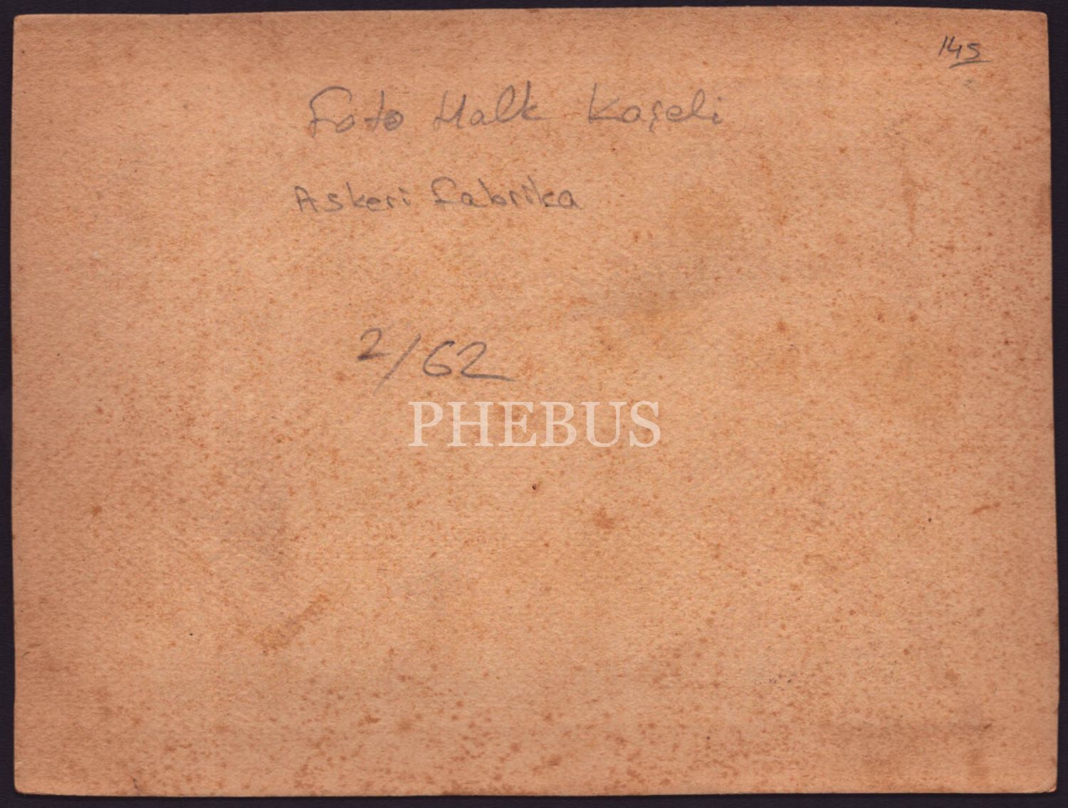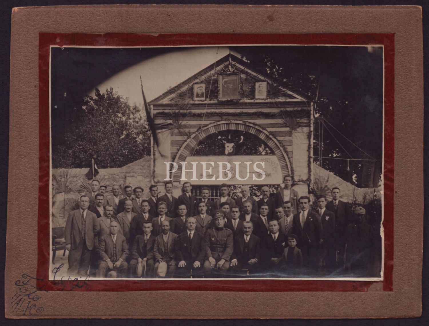 Mustafa Kemal Atatürk, İsmet İnönü ve Mareşal Fevzi Çakmak´ın fotoğraflarıyla süslenmiş Askeri Fabrika´nın kapısı önünde poz veren asker ve sivillerden oluşan heyetin toplu hatıra fotoğrafı, "Foto Halk" kaşeli, paspartusuyla beraber 21x16 cm...