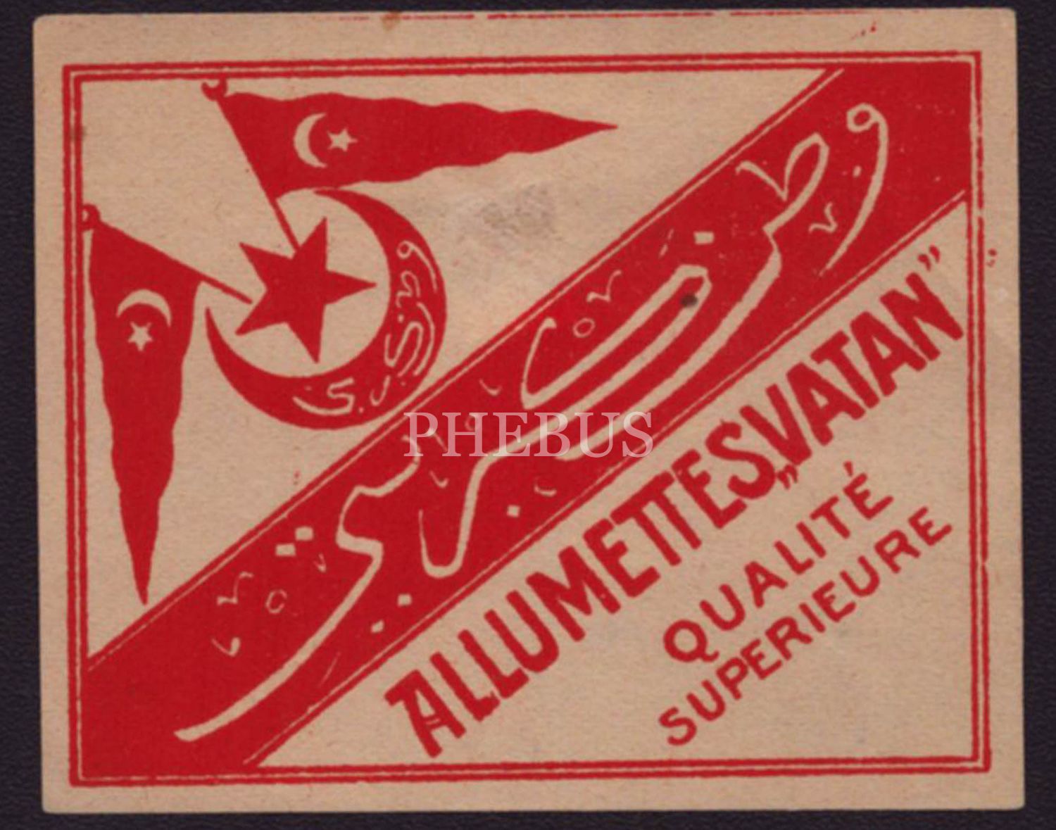 Osmanlı döneminden ay yıldız görselli "Vatan Kibriti" etiketi, "Allumetes Vatan", 7x6 cm...