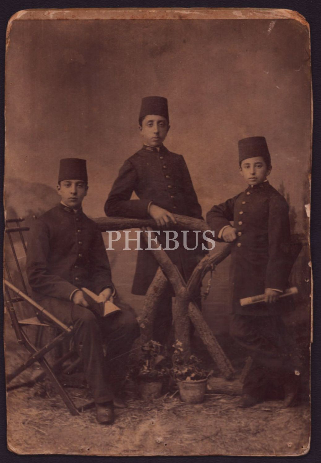 Diploma ve kitapla poz veren Osmanlı öğrencilerinin stüdyo hatıra fotoğrafı, Abdullah Freres Fotoğrafhanesi (Constantinople), 10x15 cm...